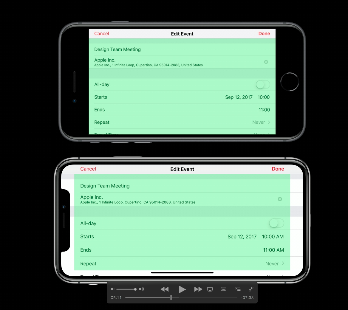 Kinda funny they compare the 5.8 iPhone X to the 4.7 iPhone 8 and not the 5.5 iPhone 8 Plus....Sure, in overall physical size of the entire phone. But when matching up screens it's actually quite a different story. Width they match the same, 375 points across. Height the X is 20% taller, BUT that is actually less because 1) the notch (although some of that is regained by incorporating the status bar into the notch area), 2) dev guidelines have margins which are larger on the X due to the notch and rounded corners, and 3) you have a line indicator on the bottom (in portrait or landscape mode) that takes up space, that the regular iPhone doesn't have. So actual content is restricted from those areas, although the screen will seem larger because the app itself can extend out, you actually won't get any content there.