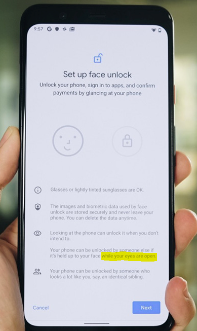 We’ve been working on an option for users to require their eyes to be open to unlock the phone, which will be delivered in a software update in the coming months. In the meantime, if any Pixel 4 users are concerned that someone may take their phone and try to unlock it while their eyes are closed, they can activate a security feature that requires a pin, pattern or password for the next unlock. Pixel 4 face unlock meets the security requirements as a strong biometric, and can be used for payments and app authentication, including banking apps. It is resilient against invalid unlock attempts via other means, like with masks.