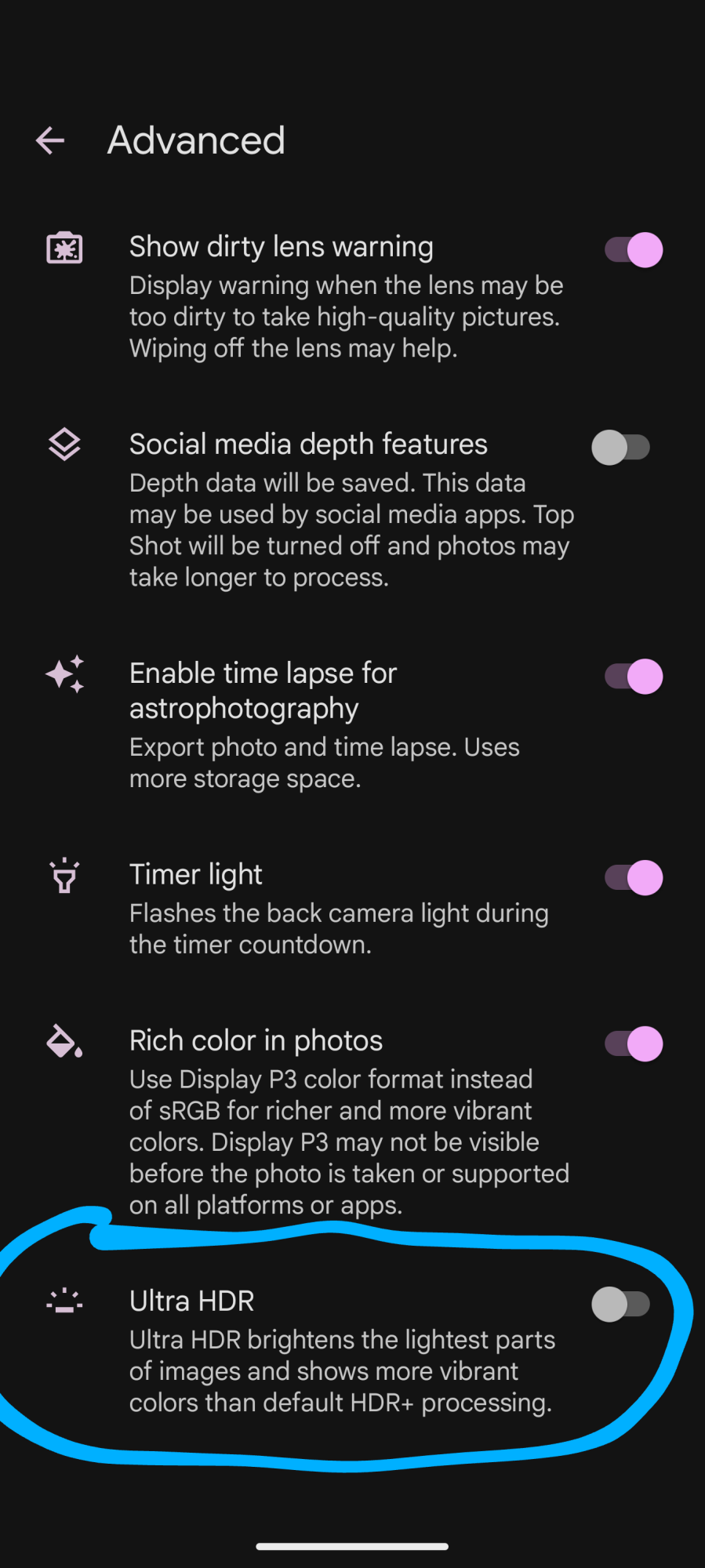It's funny because the description of ultra HDR in the options sounds like what you WANT your photos to look like, but it actually does the opposite. Or so I found.