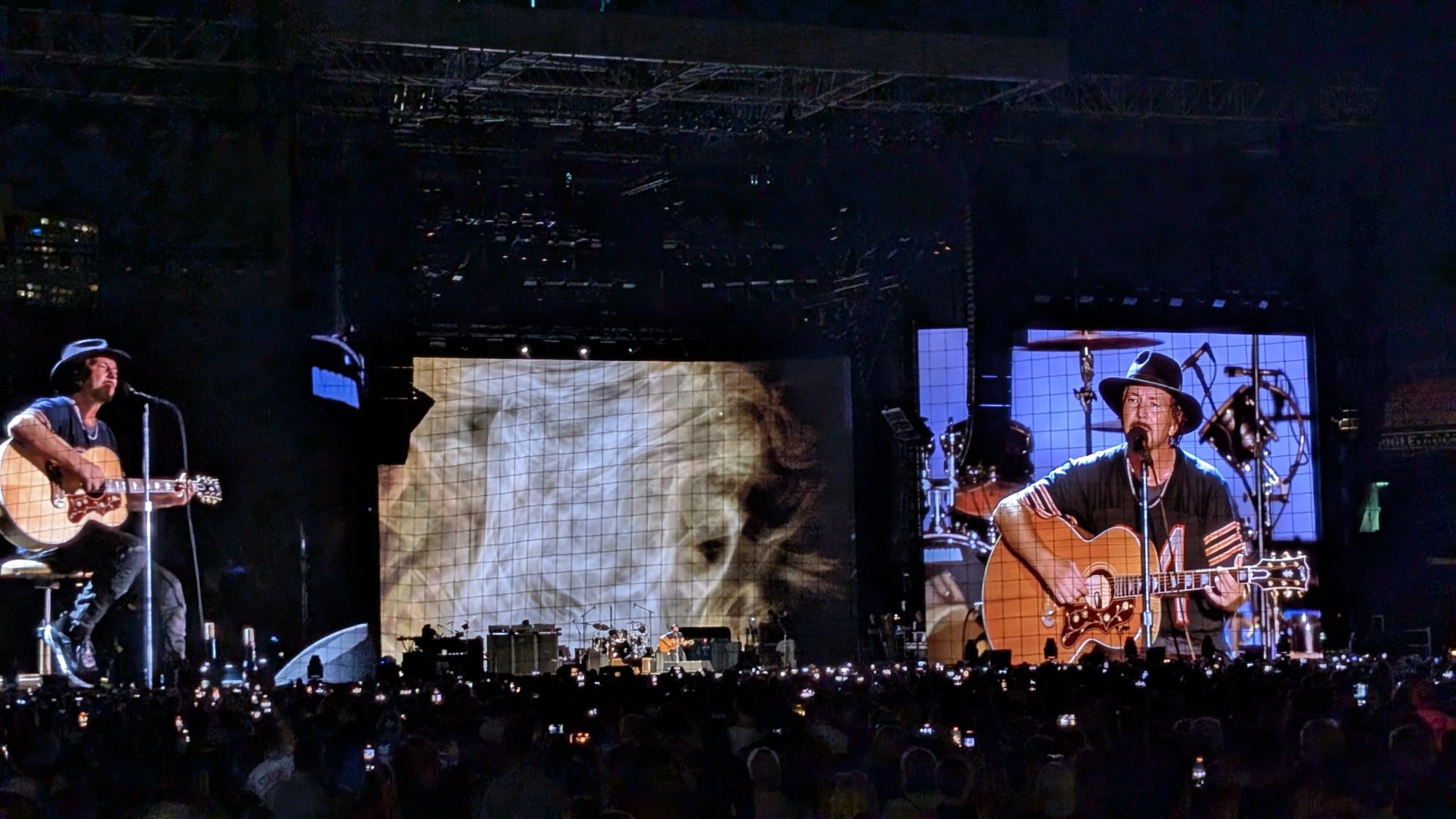 Jealous! And they opened with "Release"!Took some photos at the Pearl Jam show last night. We were sitting 3 rows behind the 3rd base dugout, but still very far from the stage + behind all the GA and field seats. These are zoomed in using the telephoto lens, looks pretty great all things considered, no zoom enhance. I tried zoom enhance on another one that I deleted, it struggles with human faces from a distance and made Eddie look like he has no face 😂 actually creepy.