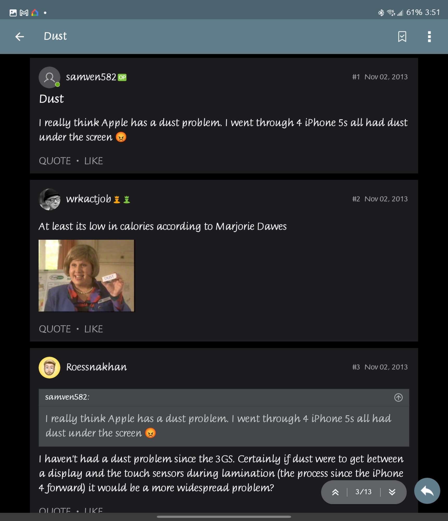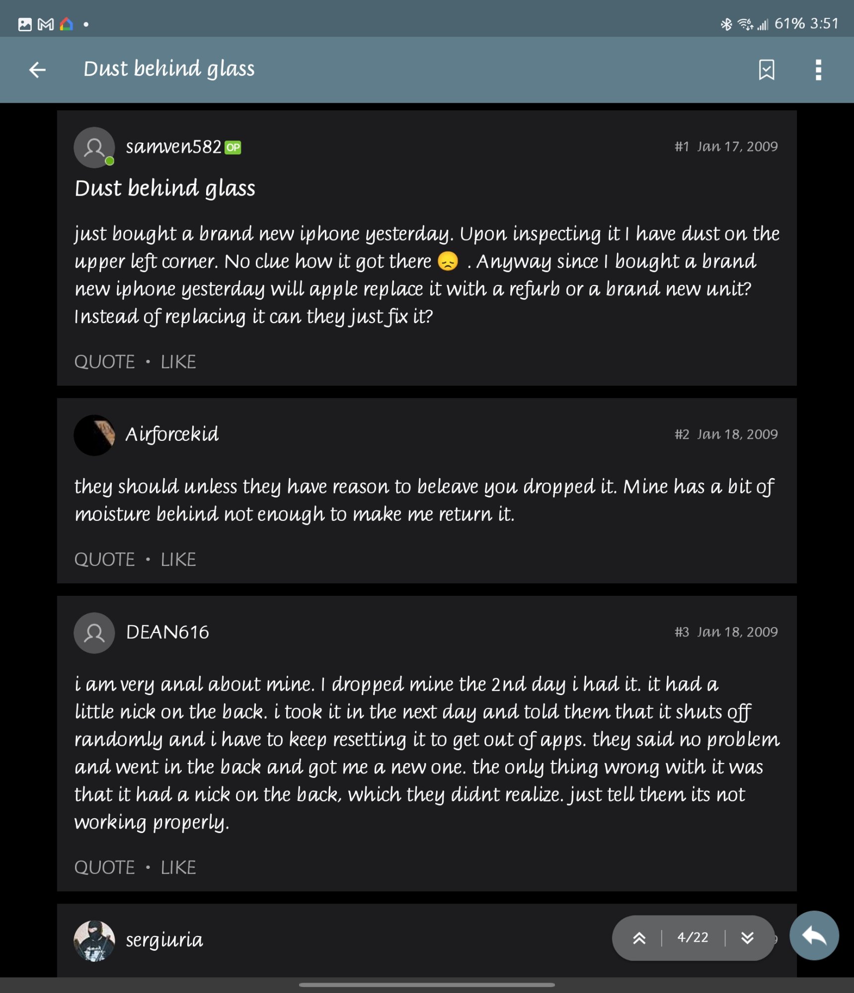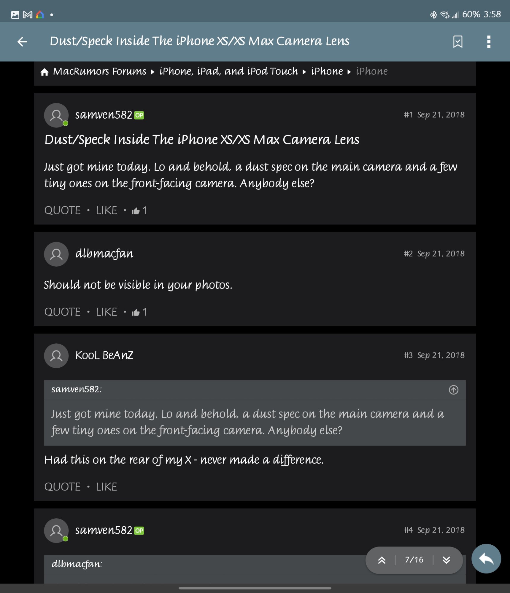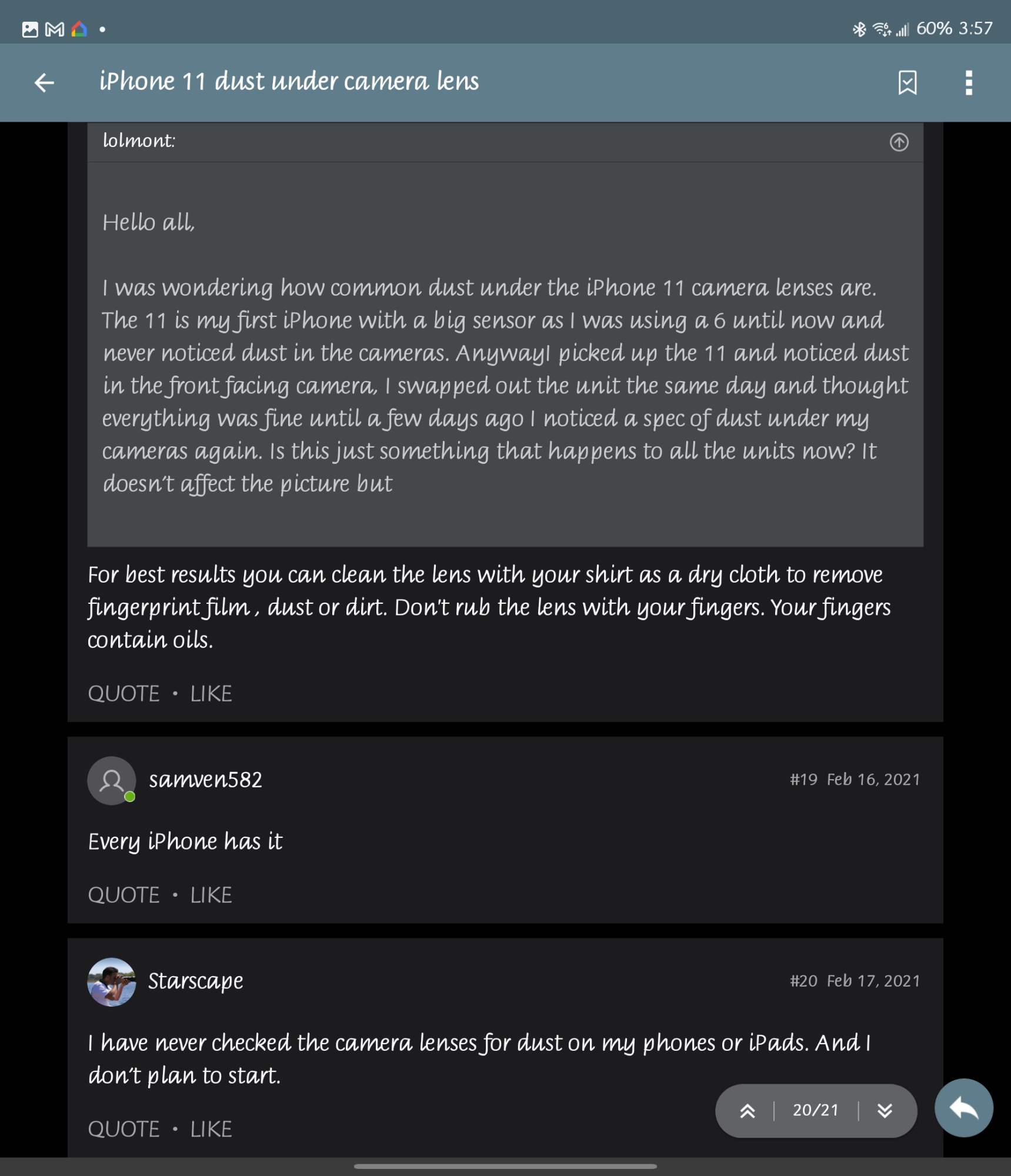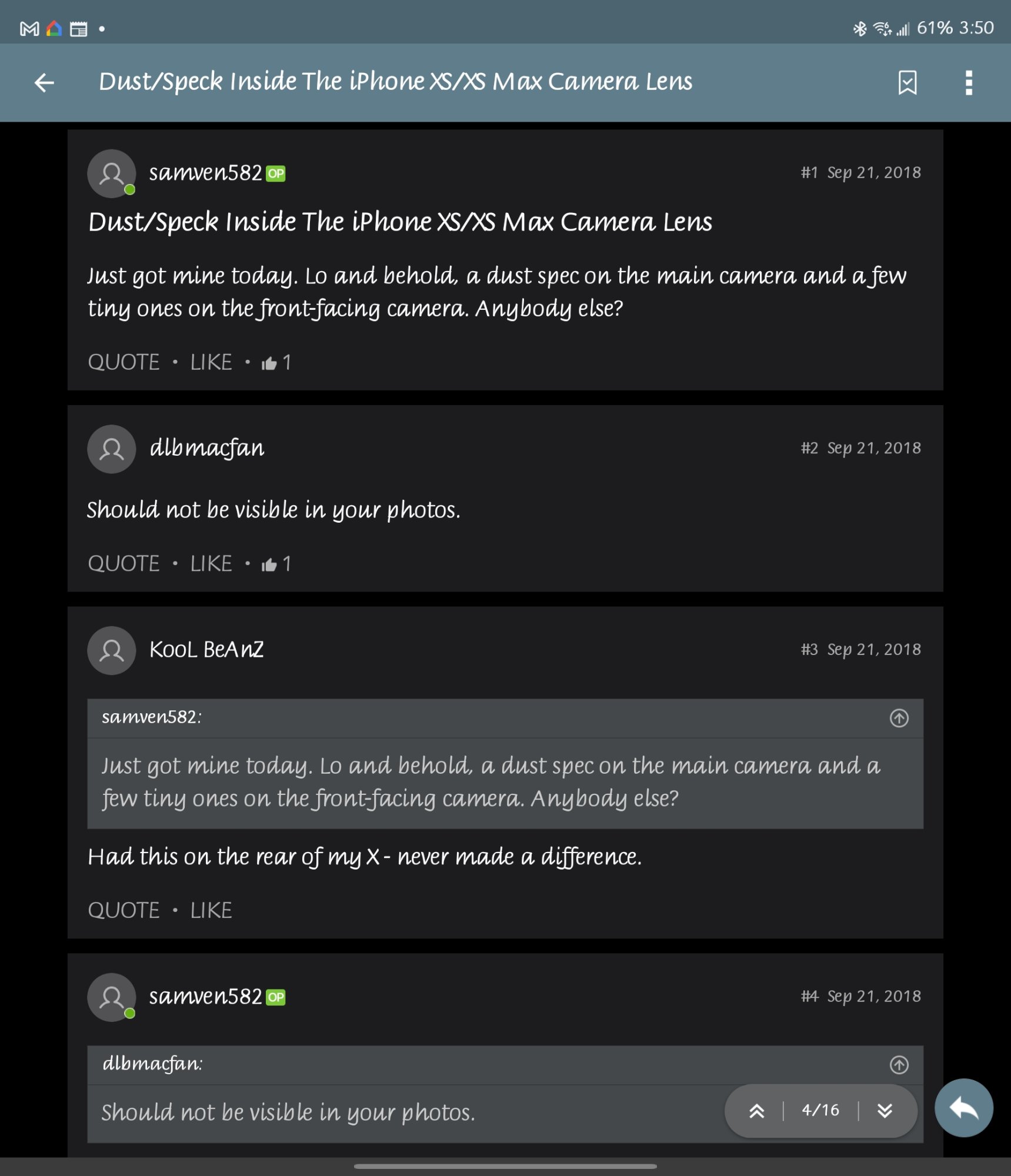I'm OCD. Scratches on my screen bother me. Scratched up frame on my 9PXL after I dropped it without case bothered me enough I bought another one 🤦♂️ But that stuff is just straight up weird. Like some kind of crazy obsession.Let me know when you want to keep talking about dust on the phones okay
