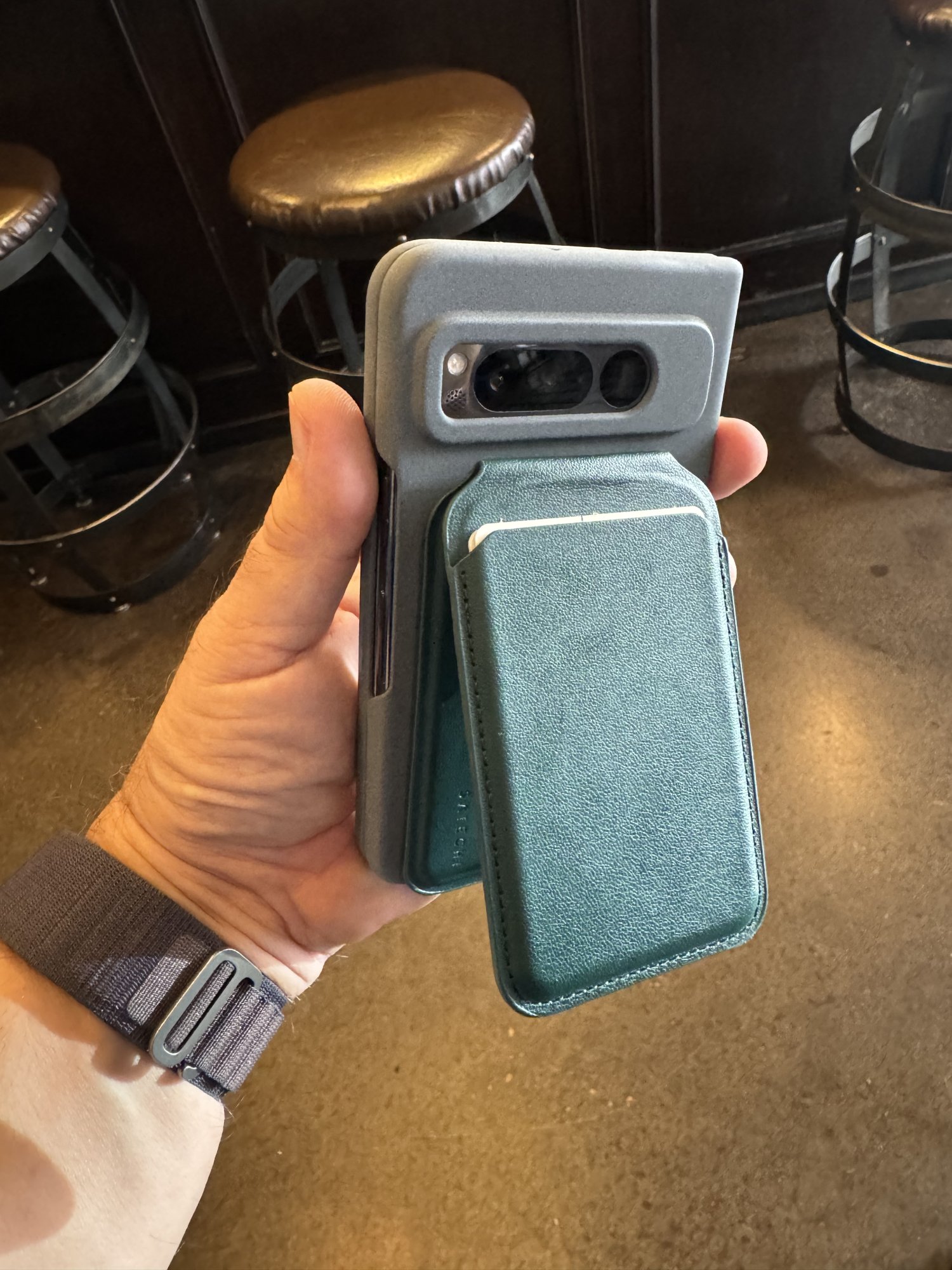 Here’s what I’m using now, a combination of a case and better self-adhered magnetic ring to give magsafe compatibility. I decided to forgo an integrated kickstand because I picked up one of these Satechi Magnetic Wallet Stands which works great as a stand. With magsafe compatibility on my Fold case, problem solved.