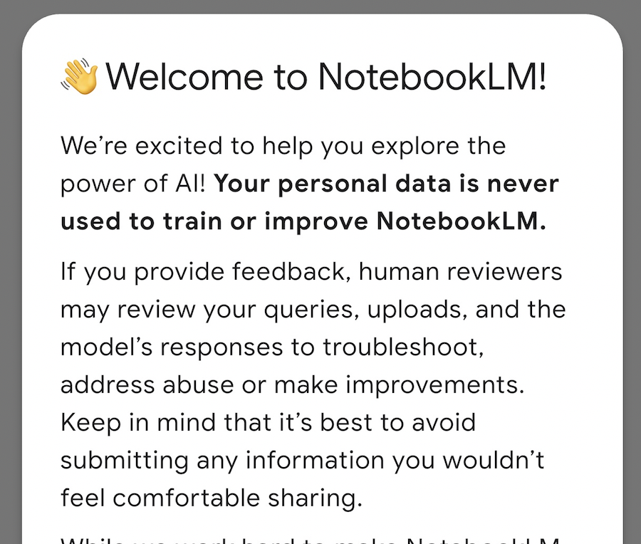 In the case of NotebookLM, Google clearly states they don’t use user content to train their models, and I assume that claim is subject to strict audits.