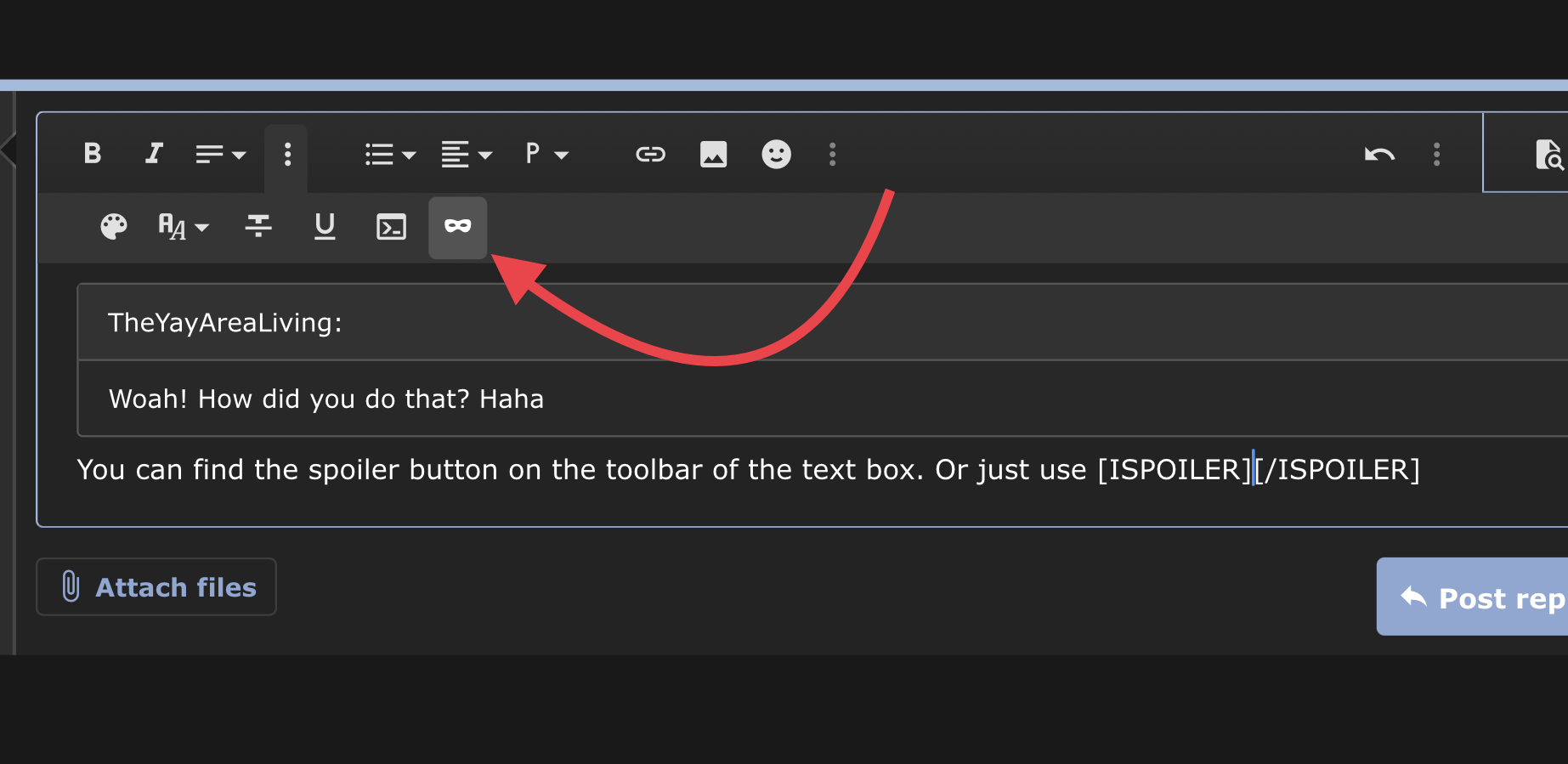 Didn’t know it existed. Thank you for showing meYou can find the spoiler button on the toolbar of the text box. Or just use [ISPOILER ] [/ISPOILER]