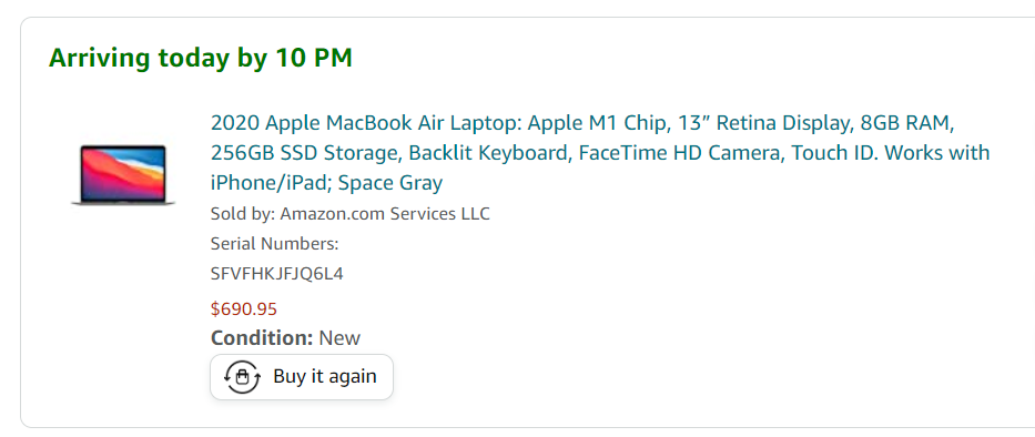 So, I switched to an iPhone this week, and I've been looking at ordering an M1 MacBook. I was looking on Amazon this morning, and somehow, I scored a new MacBook Air M1, 8 GB, 256 SSD for $690. It's being sold by Amazon, not a 3rd party supplier. I ordered it as fast as I could, and when I went back to confirm, the price was now listed as $956. I got my order in at the $690 price, and it will be delivered tomorrow. Super excited to join the Apple ecosystem.