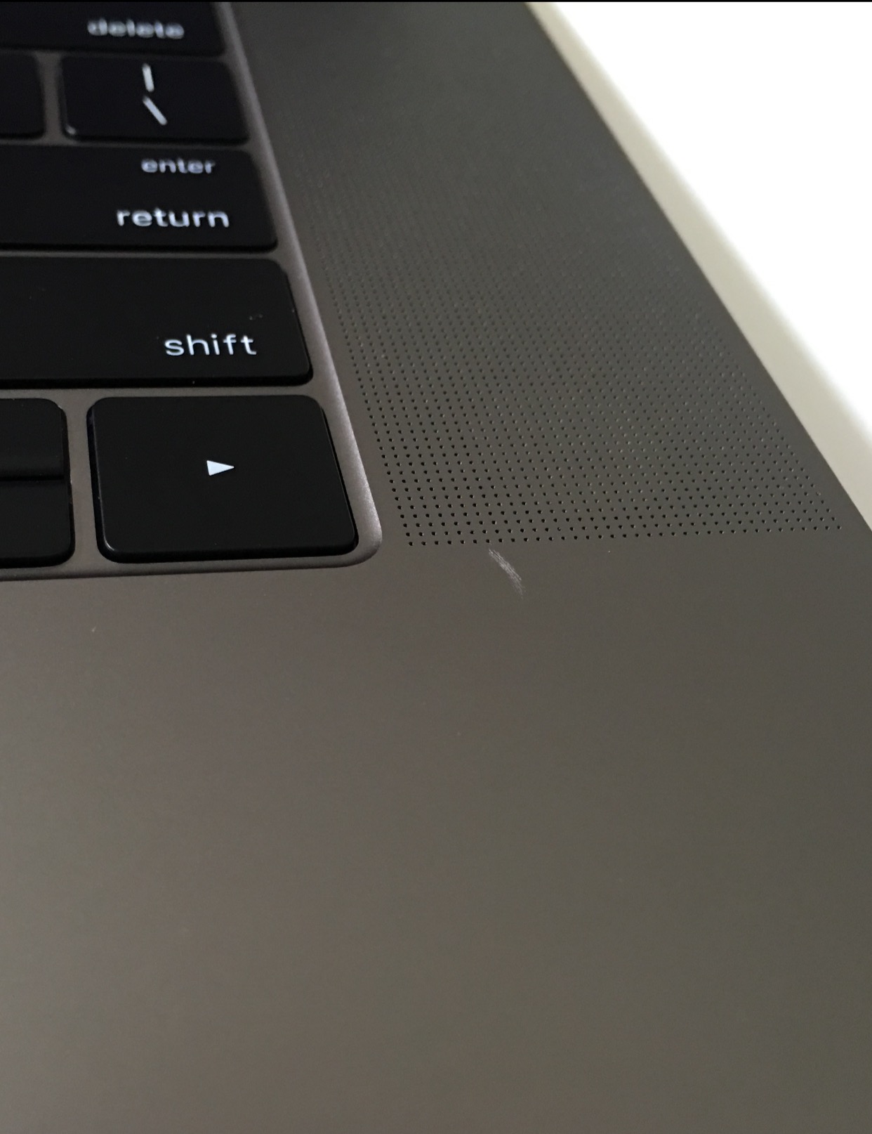 Sure return it...Mine had a similar scratch below the right speaker grill. Apple offered to replace expedite the replacement within 2-3 days after they received my current one.