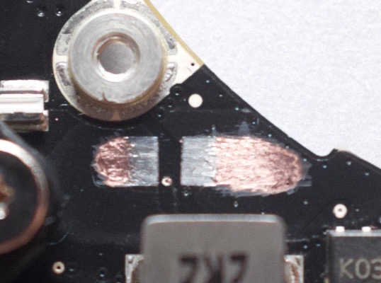 And if you use a soldering iron, I recommend to scrape also the positive pad of the motherboard by a few millimeters, it does help to solder the positive pole of the capacitor properly.