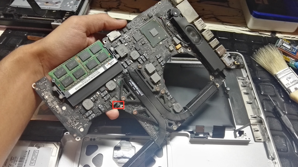 1. I open up my macbook, then u can see that horrible capacitor making my mac unusable. (yes, it's very dirty i cleaned up later)