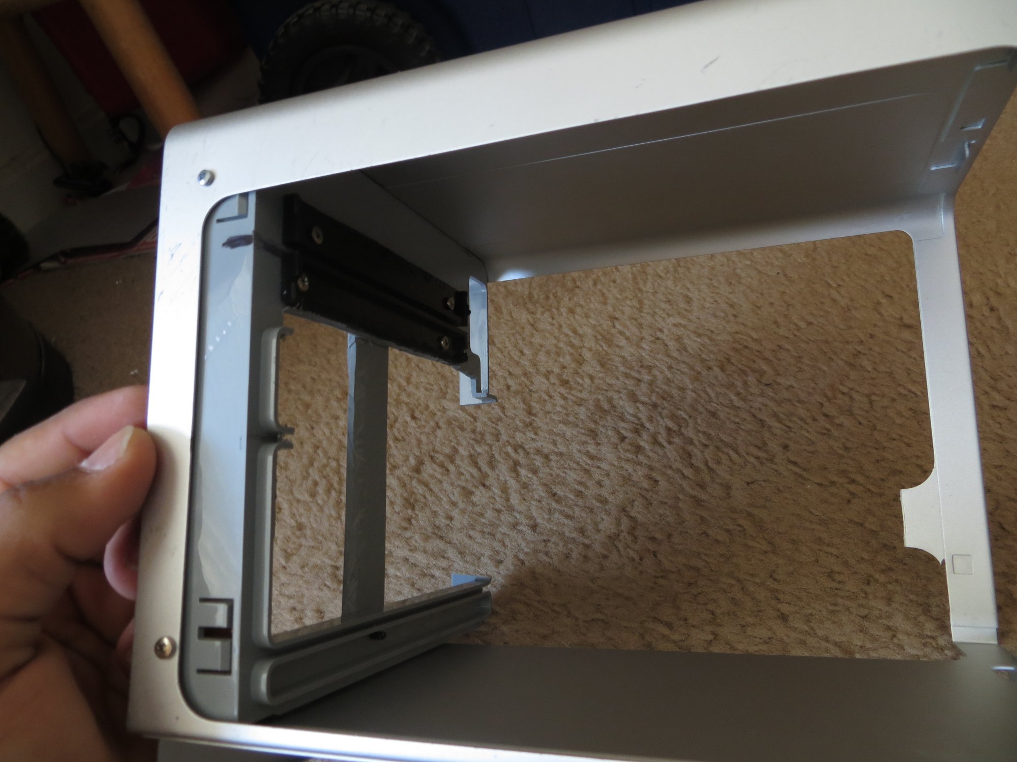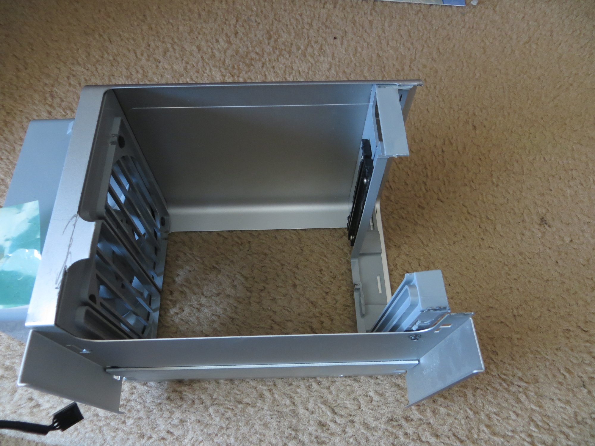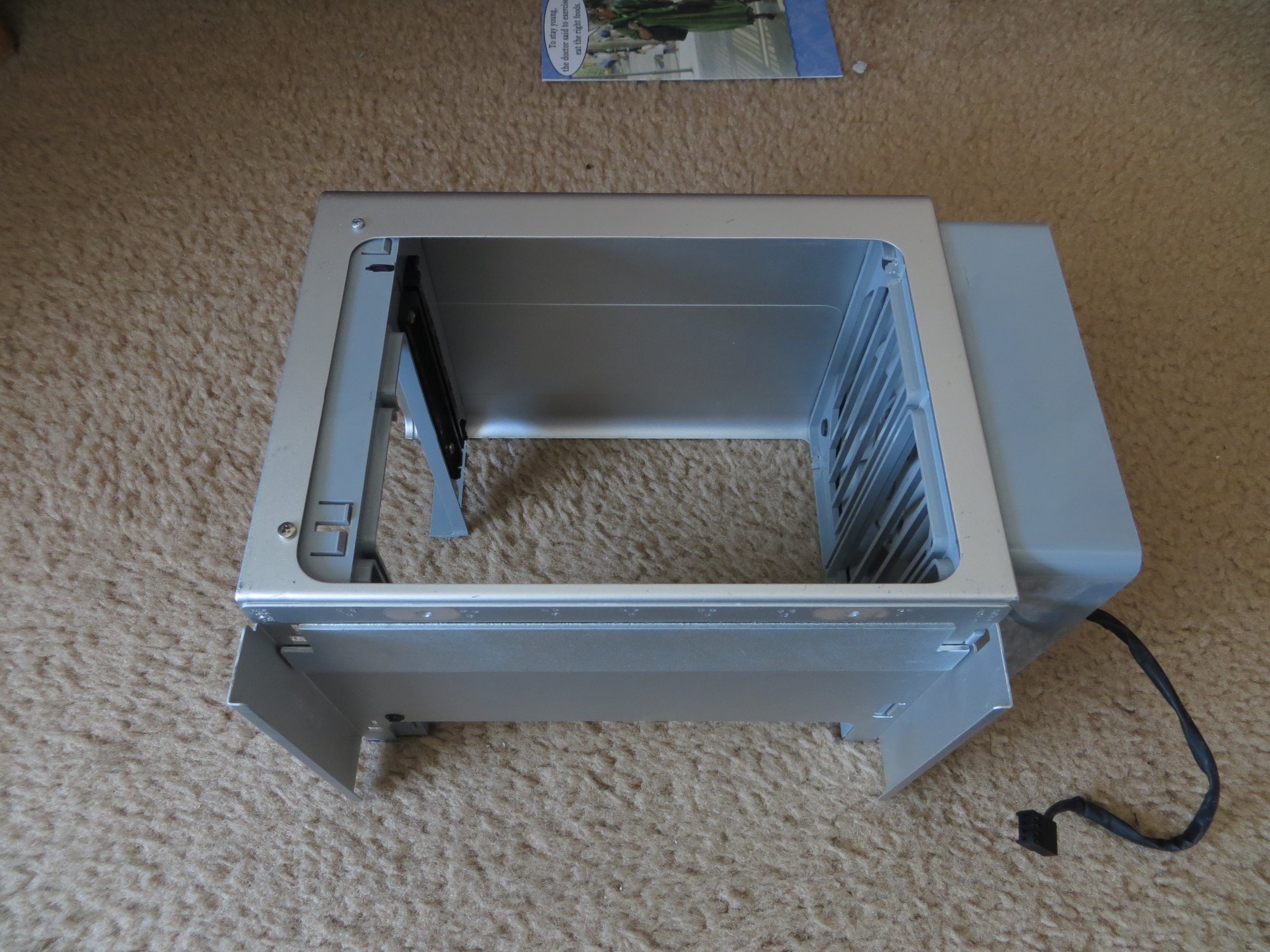 I also am yet to do anything about the RAM memory card riser cage, which has a different mounting hole pattern on the new one and is a different size. So far I have just held the RAM risers in with their connector slots and packaging tape.