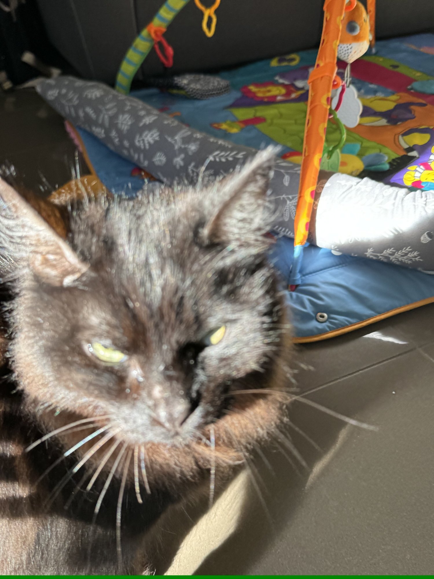This is weird. I was taking photos of a cat (not in burst mode) using 24MP, HEIF, 1.5x (35mm) in the default camera app. All the photos are fine except for this one which has this green bar or band at the bottom edge of the photo.