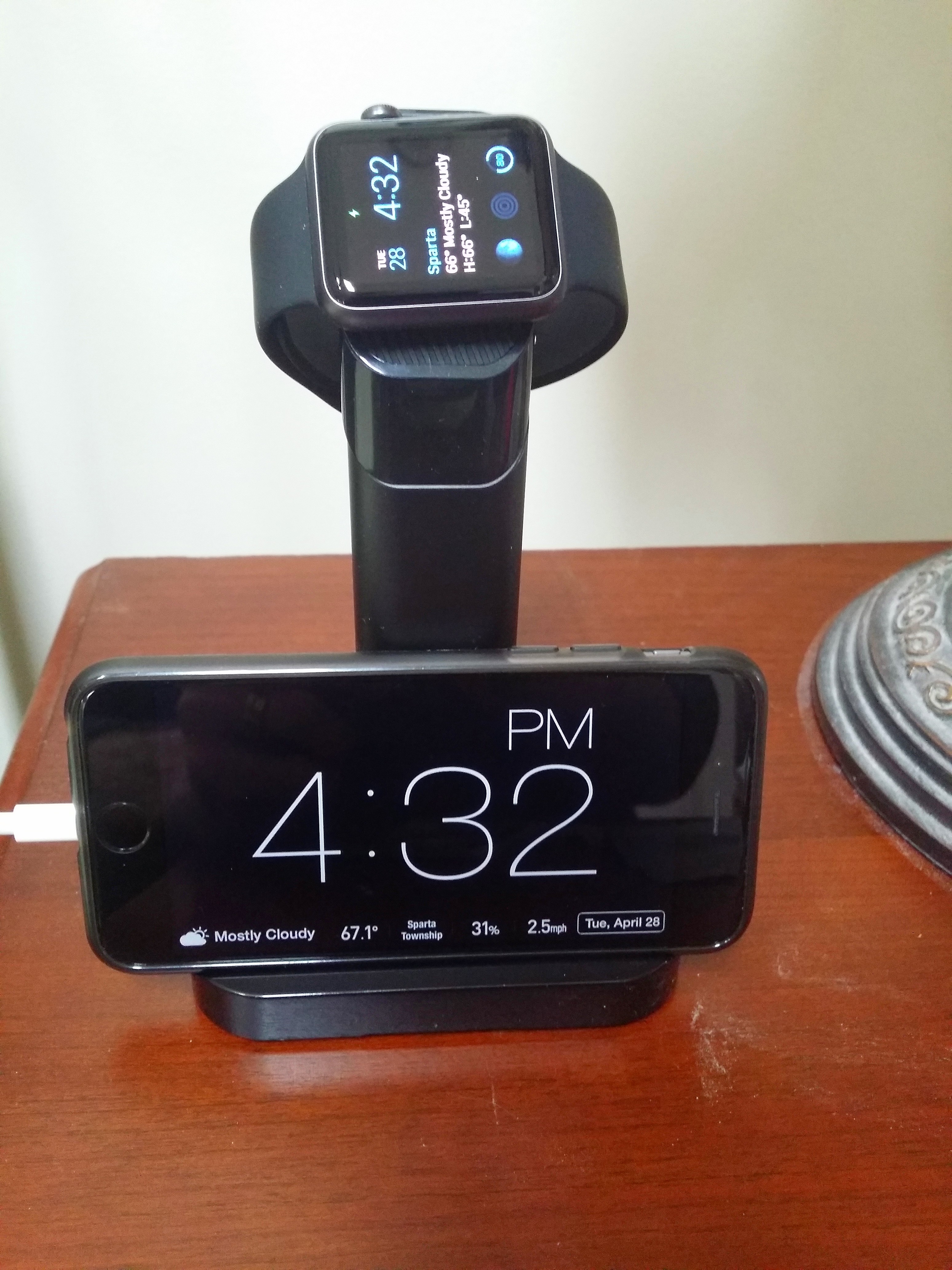 Received my Griffin Watch Stand today and I'm very pleased with the build quality. The first thing I noticed was how heavy the package was - this is because the base of the stand is weighted to prevent slipping/tipping. Also, the base has a rubberized bottom which keeps it in place too. The arm is two pieces - a plastic outer tube with a plastic and rubber insert that holds the charger puck and cord. I was concerned that the charger puck may not fit well if there was any variation between the sport and watch models (I have the sport), but it fits fine because the part that it sits in is a nice heavy rubber. This also is what touches the watch, so all the better. Also, the rubber provides a grippy surface to prevent the watch from slipping - anyone who is concerned about their watch falling should have no concerns - mine isn't going anywhere. Also, the iPhone stand holds my 6 securely and at a perfect angle - I plan to use it as my clock on the bedside table.