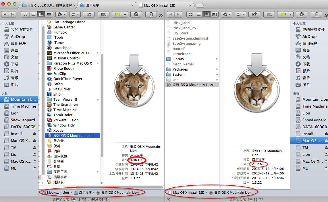 1、 4.XXGB Mountain Lion.app is REQUIRED to be in the Applications Folder.(ISO/DMG useless)