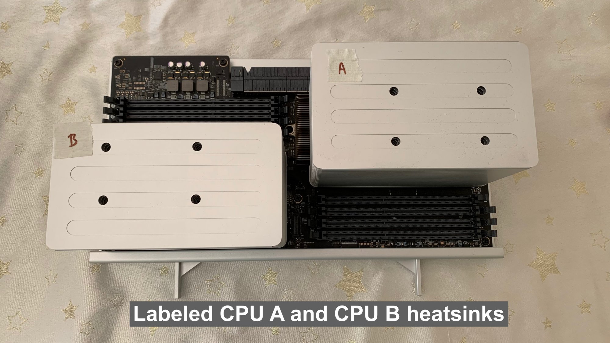 I simply placed ONE CPU into socket marked CPU A, added a small amount of thermal paste onto the IHS and gently screwed down the four nuts in the heatsink. It only takes around 3 turns to hand-tighten. The connector on the heatsink will NOT mate to the cpu board since the IHS is 2mm higher than lidless CPU but that's OK.