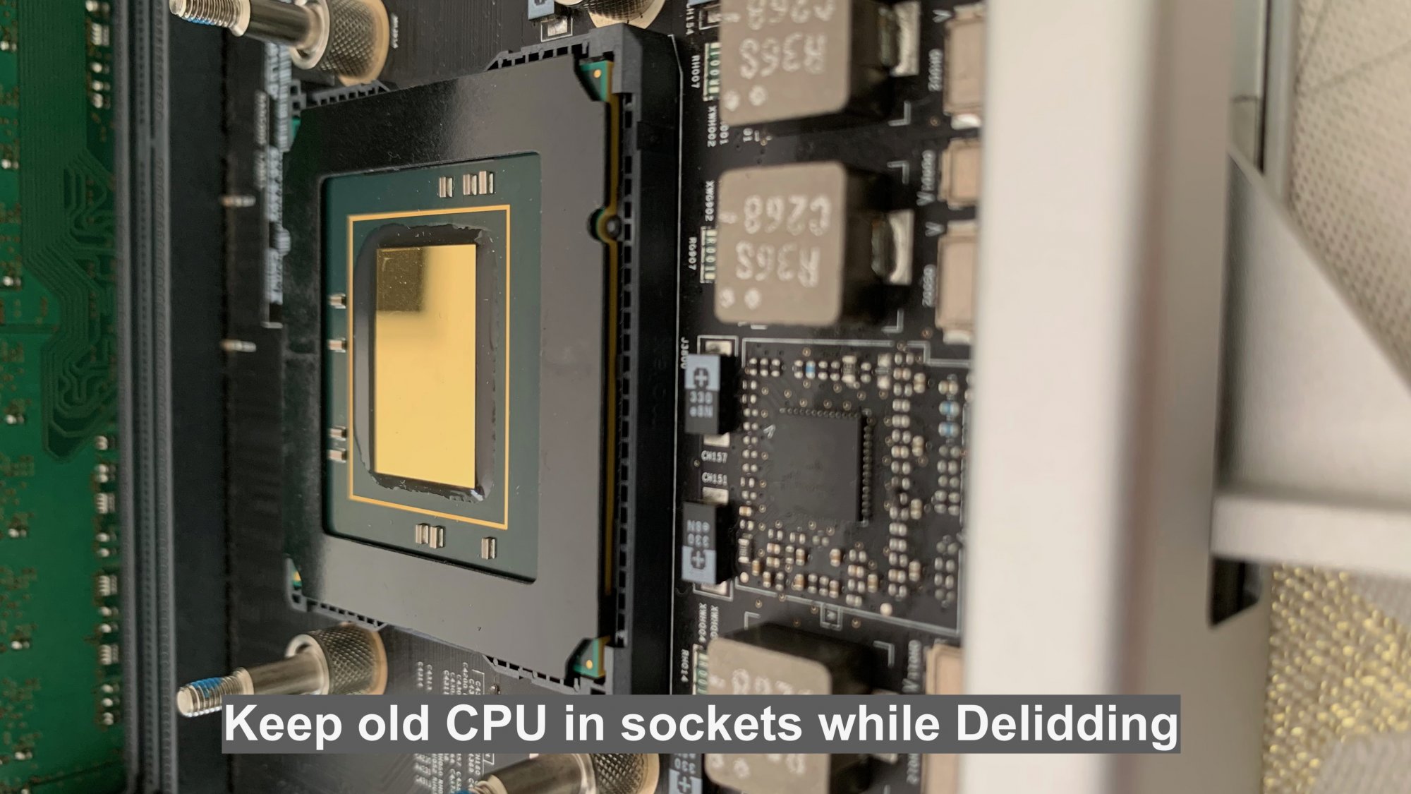 First protect the surrounding PCB as a blade is going to be used to partially scrape off the solder from the cpu Die.