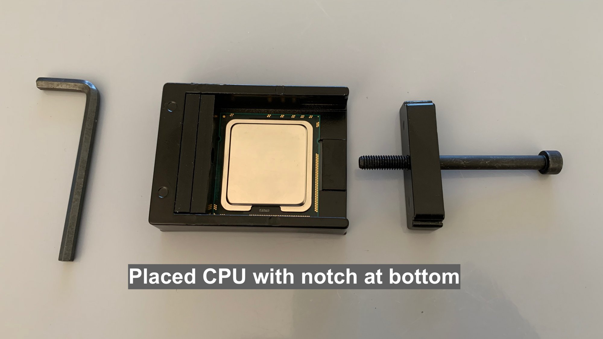 Place the CPU into the tool so that the notch in the IHS is at the bottom with the press-bar on the right