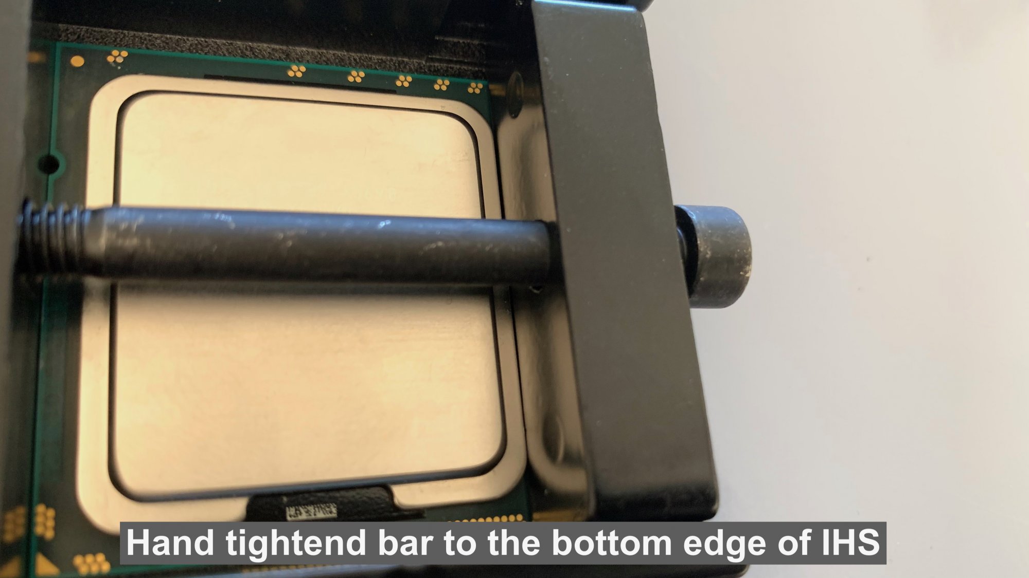Note how the press-bar is against the outer-most edge of the IHS. I believe the tool in the video presses against the top edge of the IHS.