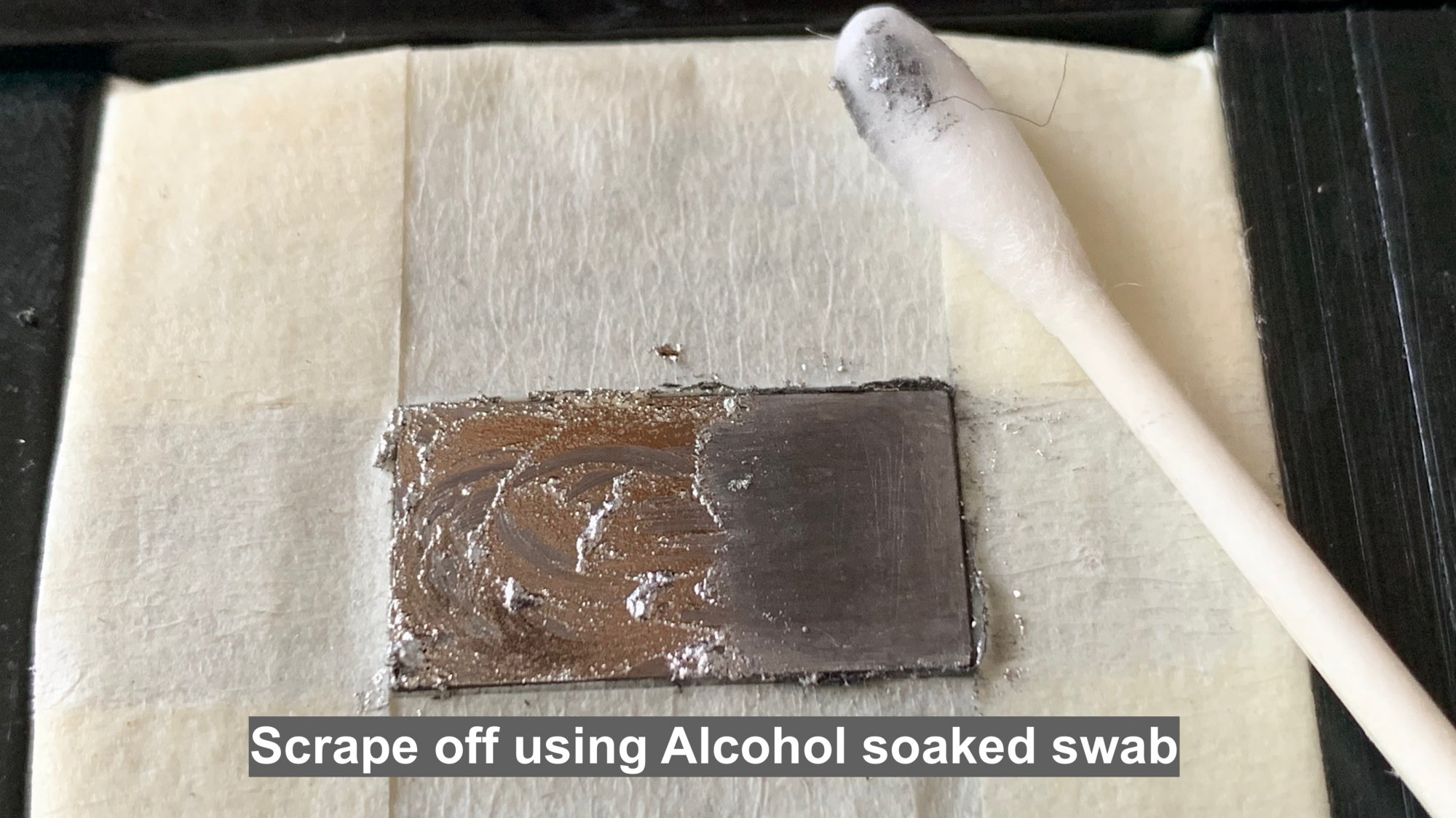 Next, to remove it soak a swab stick in alcohol (99.9% IPA) and scrap it off the Die. There's almost an immediate reaction to the alcohol on contact that seems to solidify the liquid but still movable:
