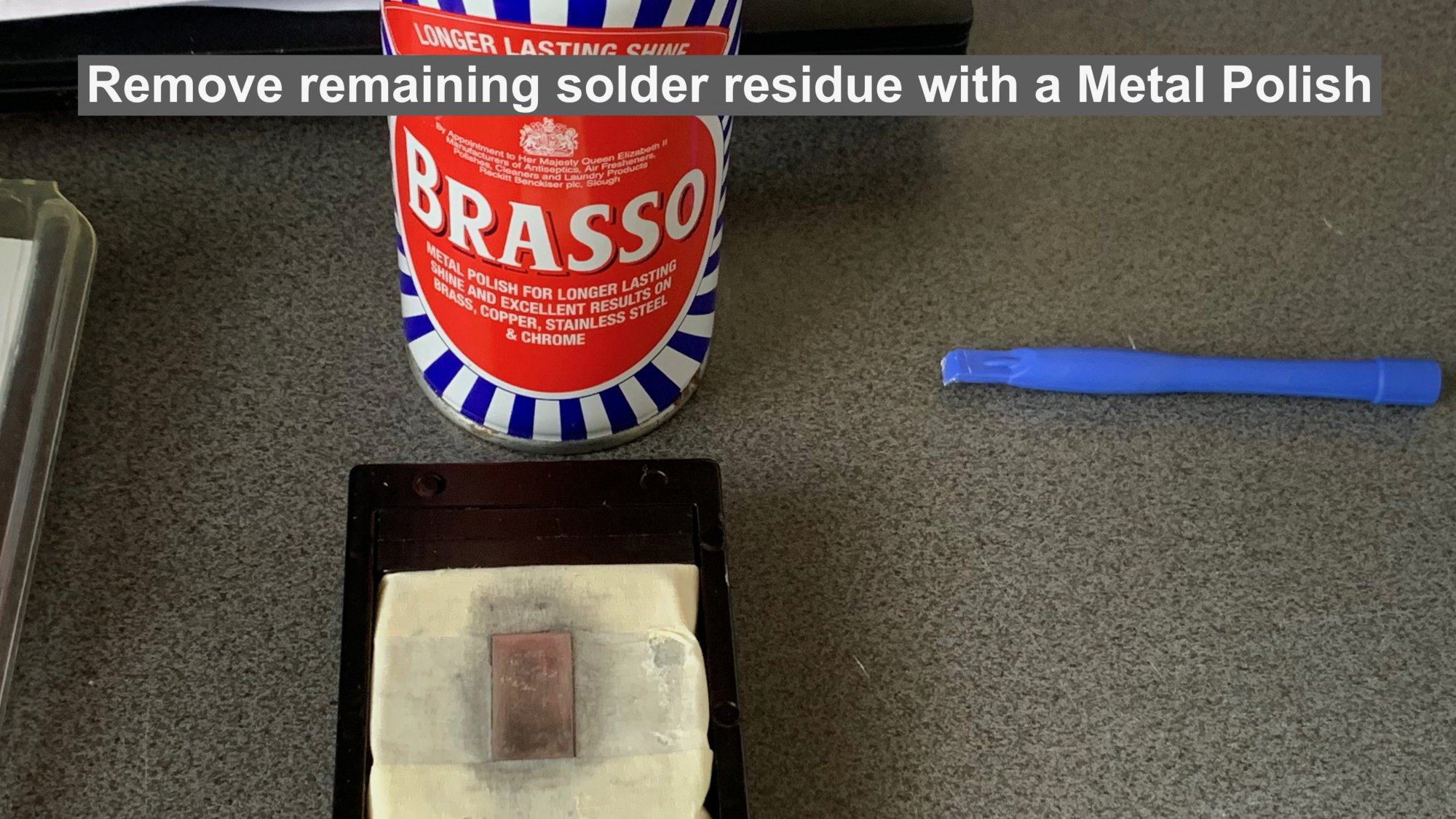 After 4 to 5 minutes of gentle polishing with a microfibre cloth, all of the remaining solder was removed and left with a mirror finish: