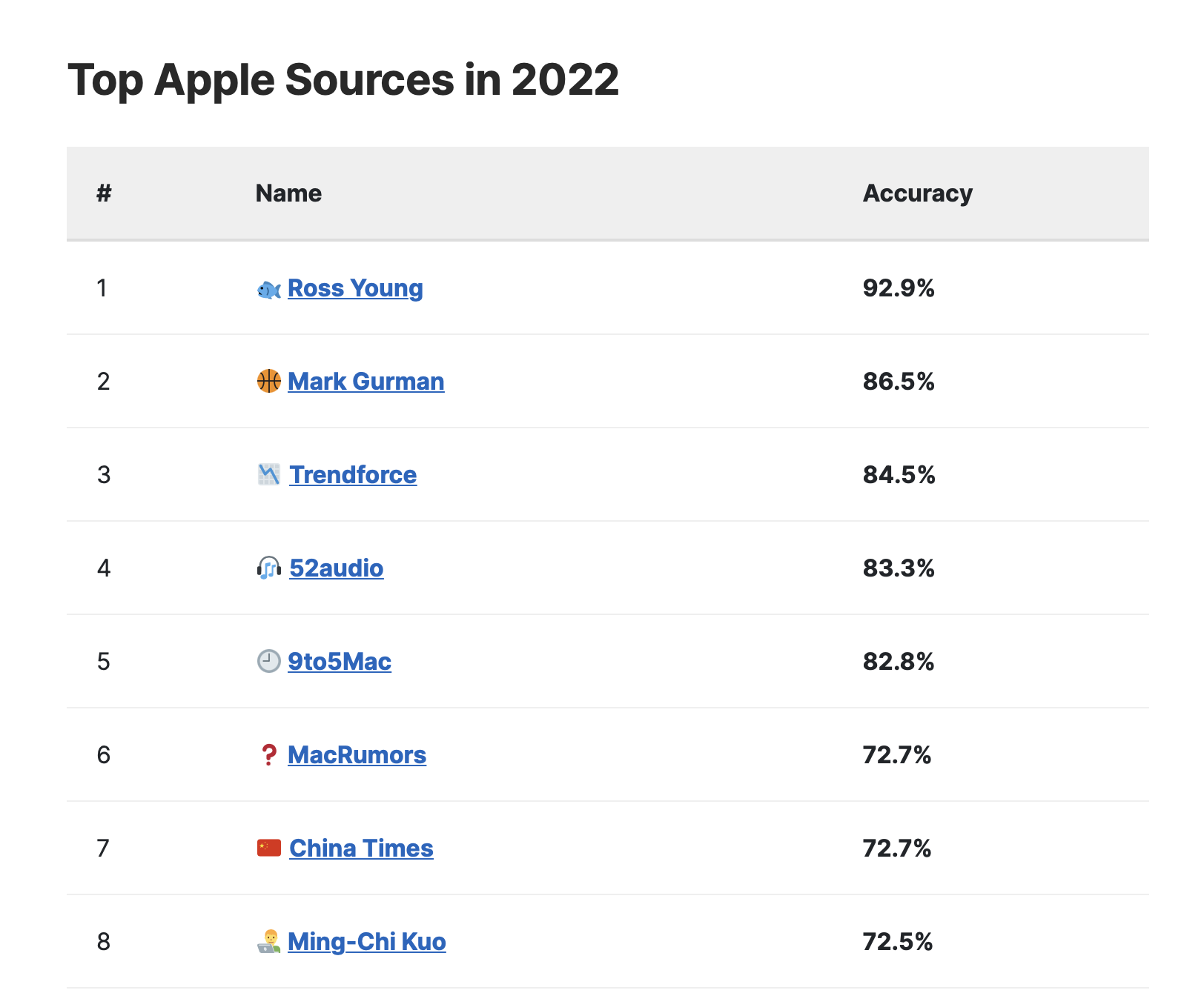 Top Apple Sources in 2022 # Name Accuracy 1 🐟 Ross Young 92.9% 2 🏀 Mark Gurman 86.5% 3 📉 Trendforce 84.5% 4 🎧 52audio 83.3% 5 🕘 9to5Mac 82.8% 6 ❓ MacRumors 72.7% 7 🇨🇳 China Times 72.7% 8 👨💻 Ming-Chi Kuo 72.5% 9 🧻 Jon Prosser 69.1% 10 🍍 Max Weinbach 69% 11 […]