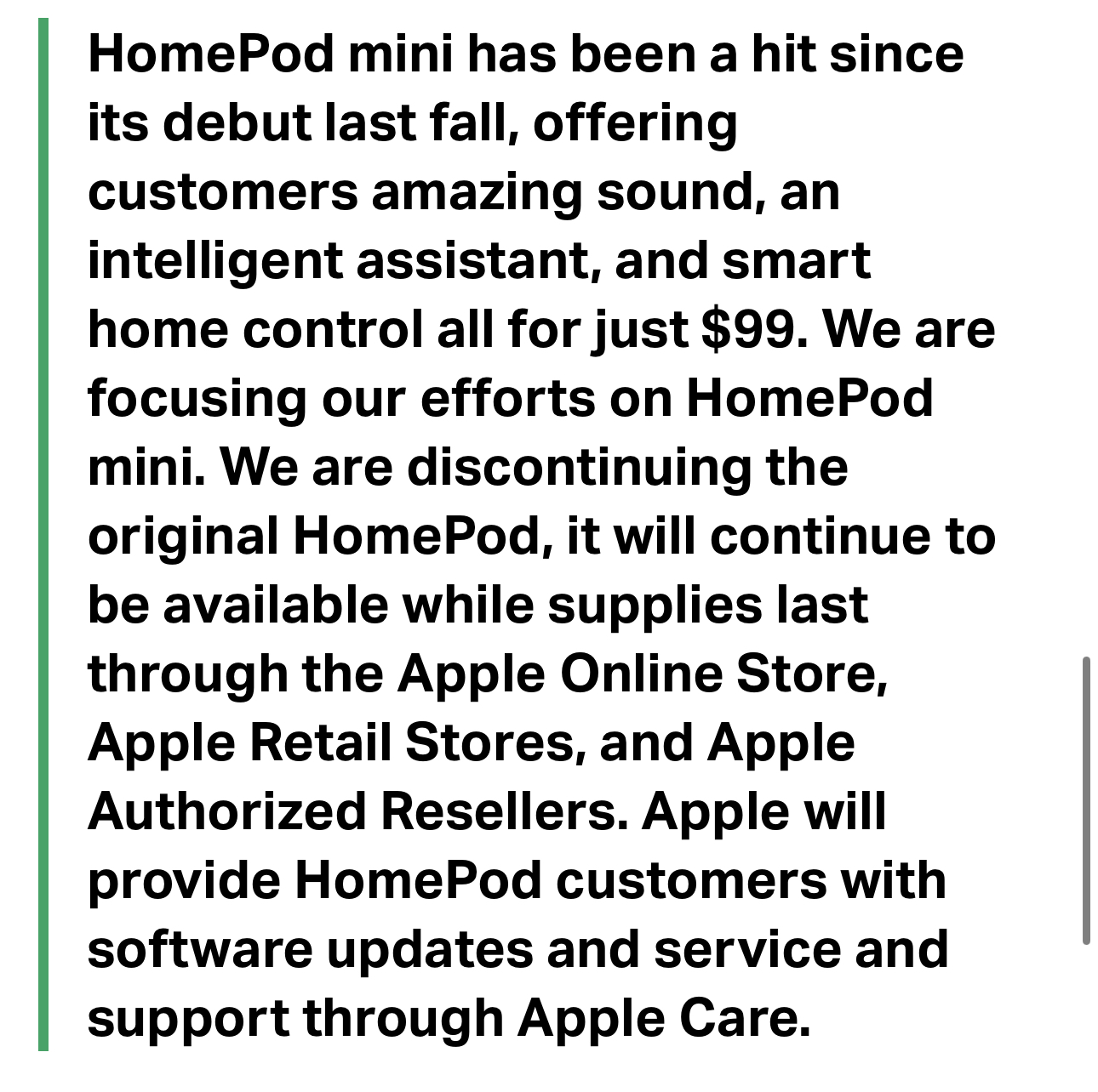 You're missing the point. Apple introduced the OG HomePod as a multi room audio smart speaker solution. It had amazing sound quality. Many started to invest with the confidence that over time they could expand to additional rooms. Apple then unceremoniously discontinues the OG and state that their focus is now the Mini. The Mini as an alternative is quite frankly pathetic, and I for one am glad the OG is back.