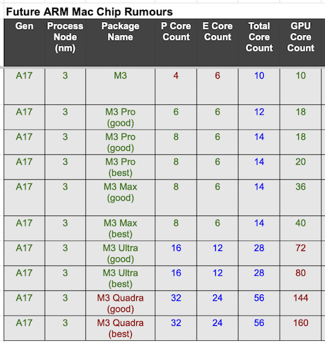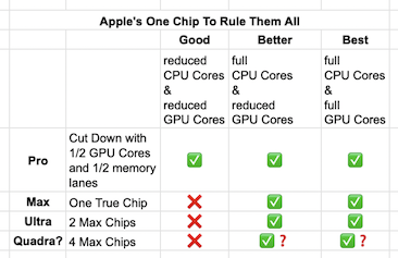 People keep proposing lots of variations of M3 Pro/Max SKUs but there's only going to be a few. Unless Apple goes off and does something entirely different they're designing ONE TRUE CHIP chip: the M3 Max (M1 had more variations, I don't know if "Better" is still happening?, and we didn't get an M2 Ultra yet):