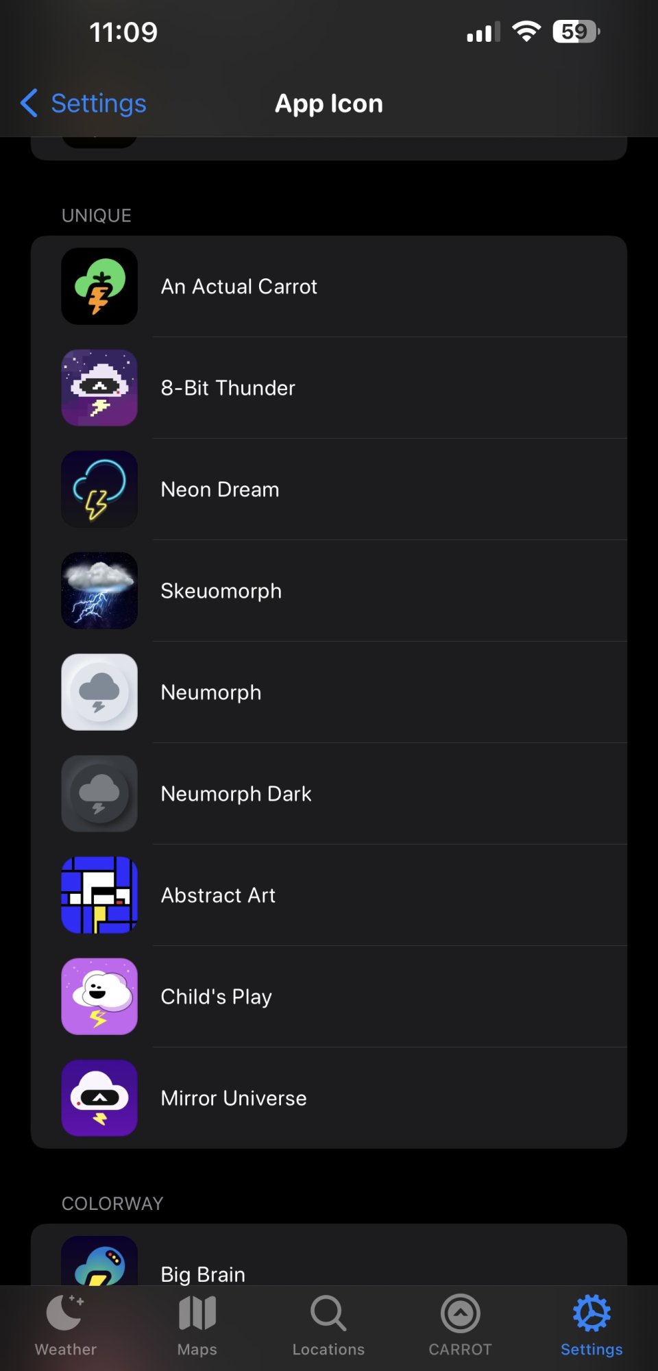 What? Some devs do have optional icons like for carrot weather, I think it has 57 to choose from, I wish more devs did this because some icons are hideous.