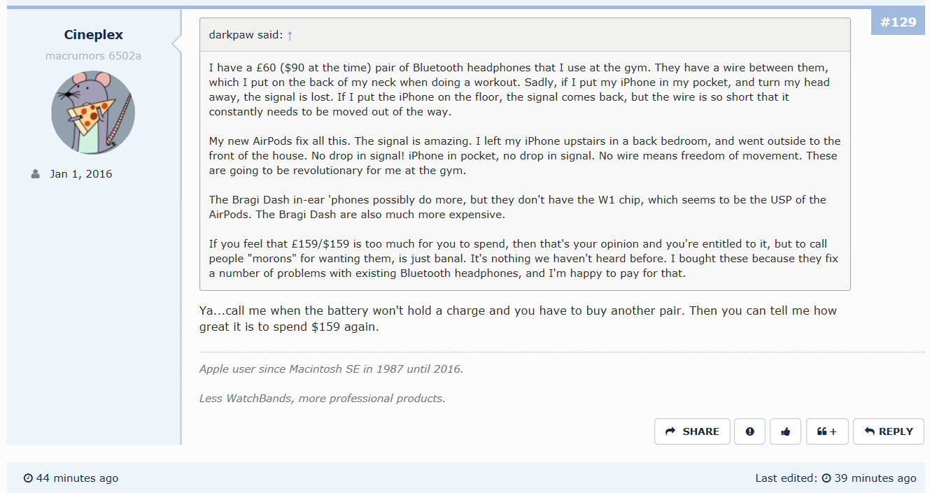 As for the AirPods, the connection technology seems nice and a step up from standard bluetooth, and the charging case and charging speed are nice as well, but I have to agree with other commenters - but 5-6x the price for something with roughly the same audio quality as the stock ear buds that come with an iPhone is a nonstarter. I get that there's a premium for new/cutting edge technology, but $130 is more than most people will swallow.