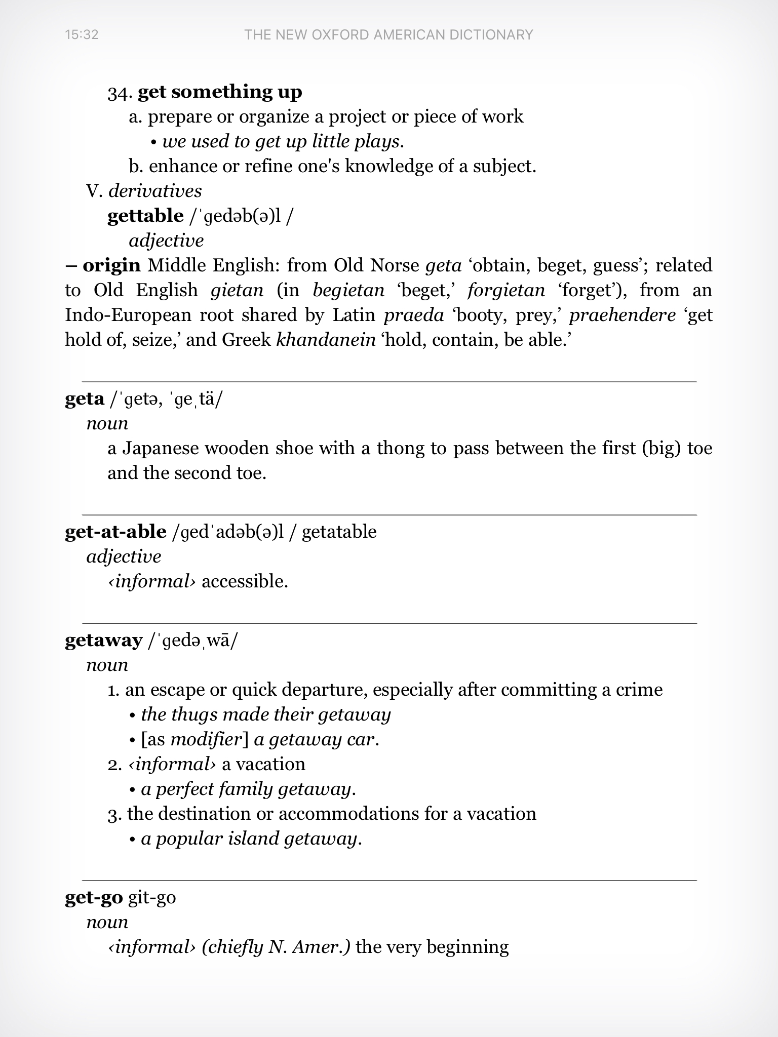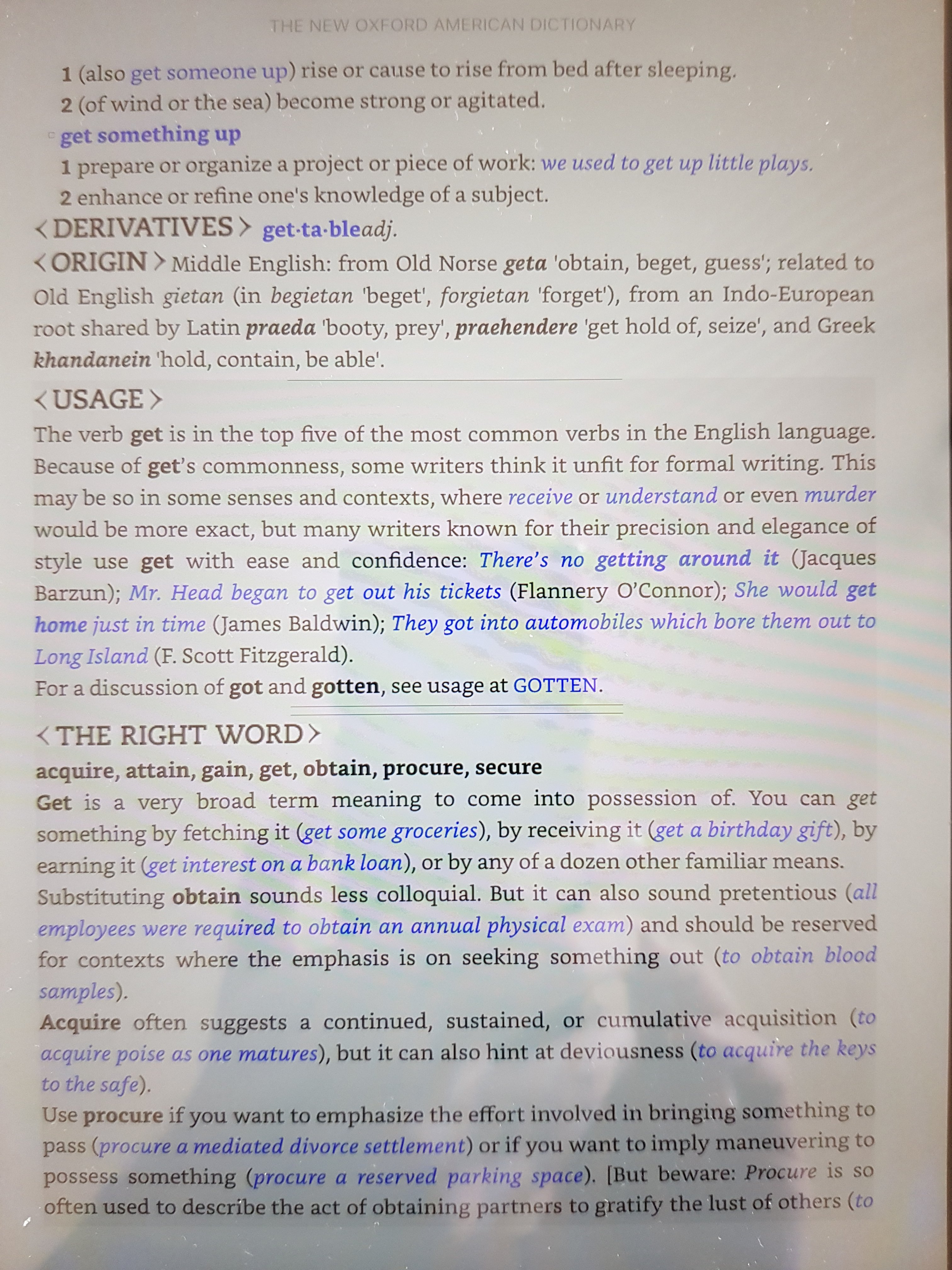 Another question, re the Kindle app. The Kindle app on my iPad is not the latest version and that is why I am asking about this. The integrated dictionary in the app is The new Oxford American dictionary. In my (old) version, the dictionary has in addition to the word explanations some thing called "the right word". See below, for example for the word 'get'. It is at the end of the word explanation, after 'Origin' and 'Usage', and it is kind of comparison of several words meanings that are synonyms. In this example for acquire, attain, gain, get, obtain, procure, secure. Does this still stay in the latest updates of the Kindle app? I am asking, because I see that it is gone for the kindle app on Android using the same dictionary. The word explanation simply ends with the Usage. Can someone please check?