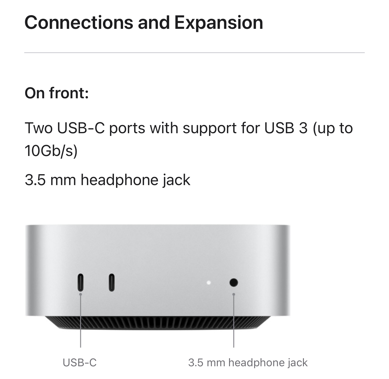 They did it on the Mac Studio? I understand your point.That’s not how Apple decides on things. If they did that, the back might get too dense and fugly? Also, the chip might not have enough lanes to support that many high speed ports when it scales into a TB5 with M4-Pro. They’d much rather keep everything nice and neat.