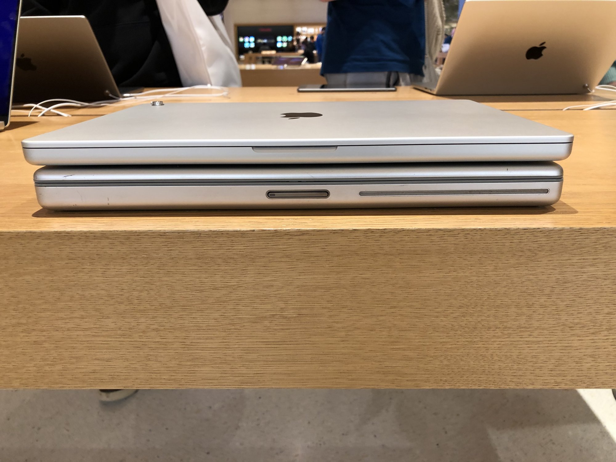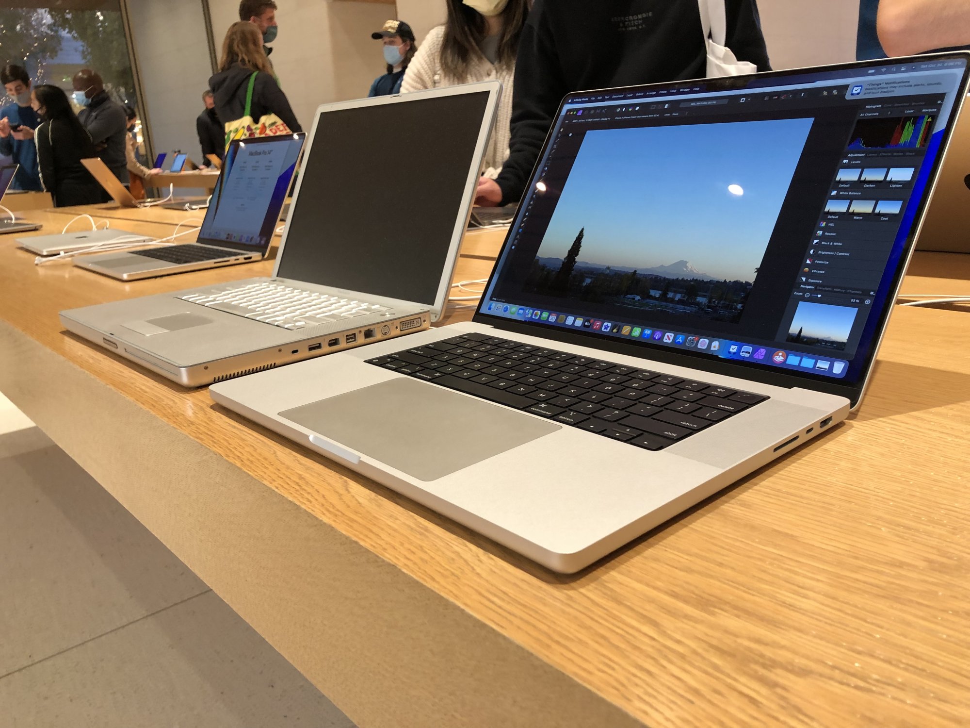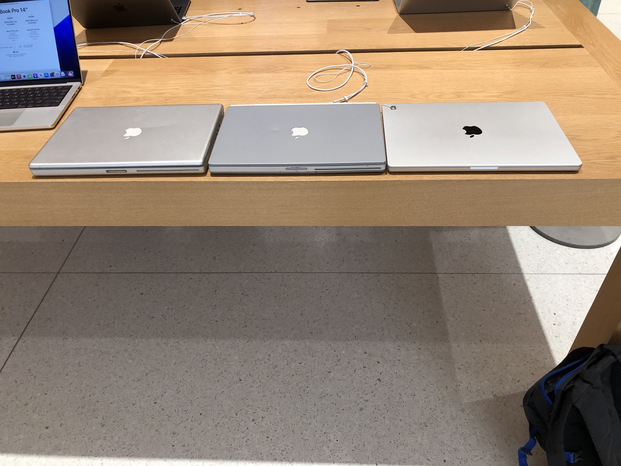 I brought a couple older PowerBook G4 devices to the store with me for comparison purposes, because this seemed to be the big talk when persons see the devices. To be honest, they are not that much alike, there is some DNA there, but thats about it. Grandpa in the middle there (Titanium). The 2021 16 inch is slightly bigger that both the 2001 and 2005 PowerBooks in the image below.