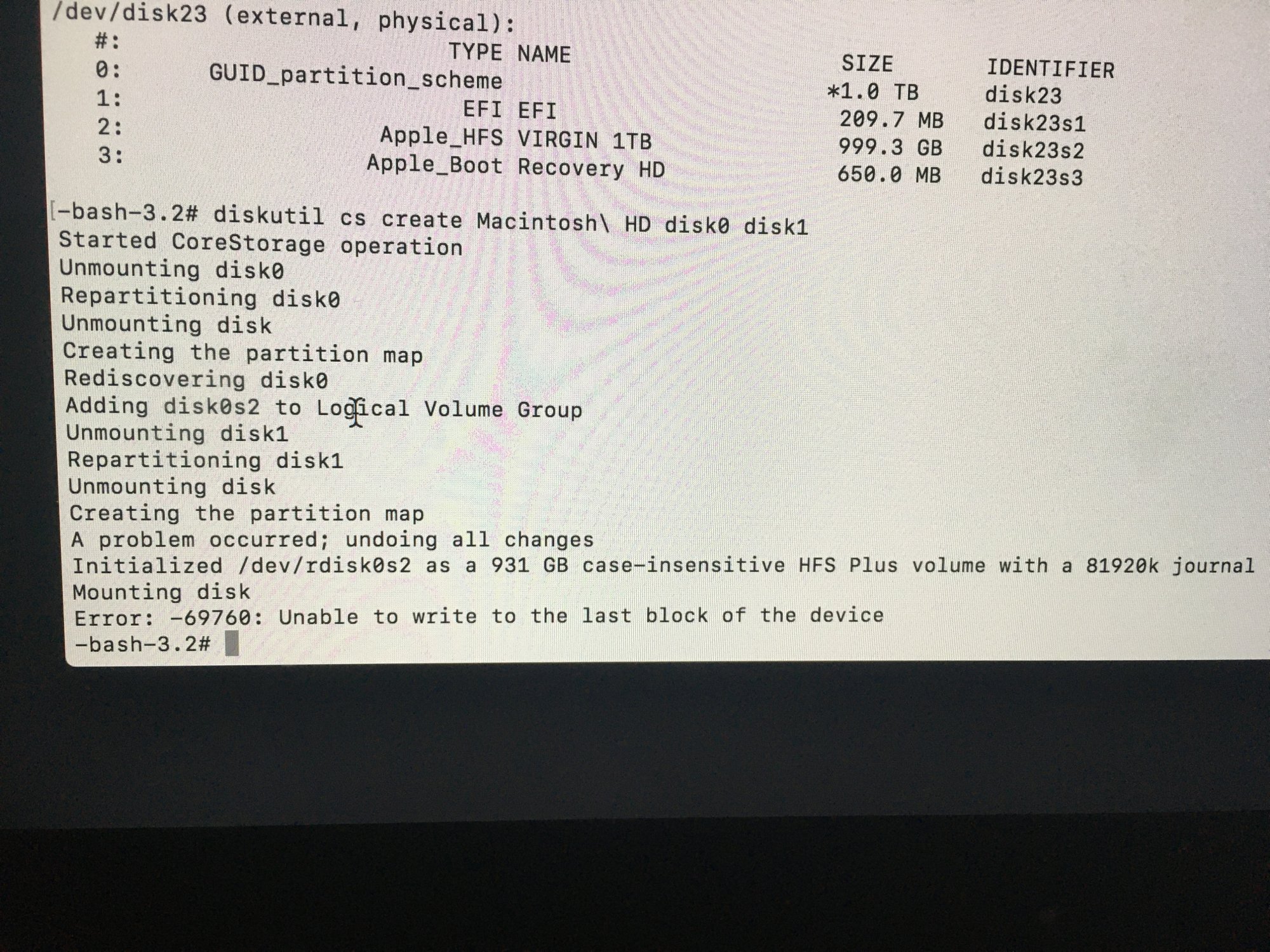 days with Mac support couldn't reset fusion drive and it often says failure trying to write to the last block etc ... The fusion was split about a year ago - under Apple support guidance - following an email problem.