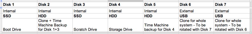 1 OS SSD, 1 scratch SSD, 1 bootable backup (1TB), 1 3TB storage drive, 1 3TB backup drive.