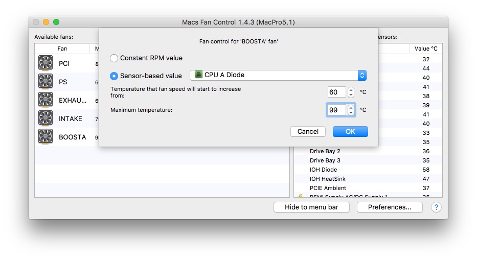 A simple work around would be setup your own Boost A fan profile in MacsFanControl. e.g.