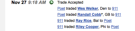 Wes Welker and Randall Cobb for Ray Rice and Riley Cooper. I wouldn't call this a completely fair trade....but I don't think its particularly egregious either.....