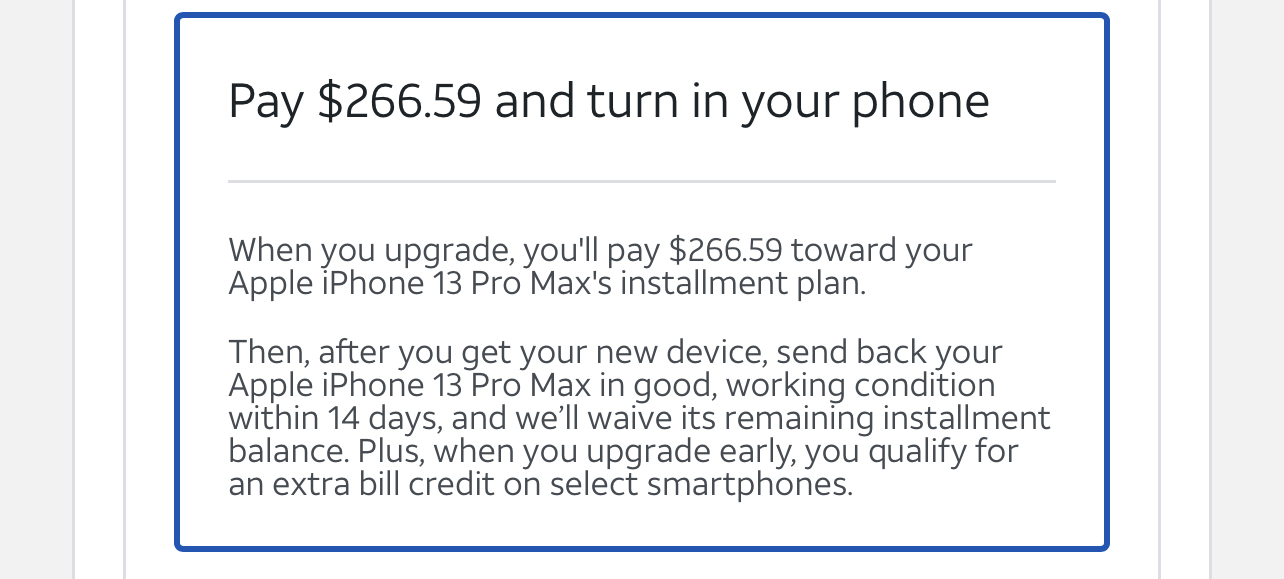 If I wanted to pre-order the new iPhone 14 Pro Max tomorrow, I’d need to “pay off” my current iPhone 13 Pro Max. So, I’ve paid 12 out of 36 months right now (it’s been 1 year since the iPhone 13 Pro Max) — so if I only owe $2.75 a month, I’m on the hook for 24 months, so I should just pay AT&T $2.75/month * 24 months = $66, and I’m golden, right?