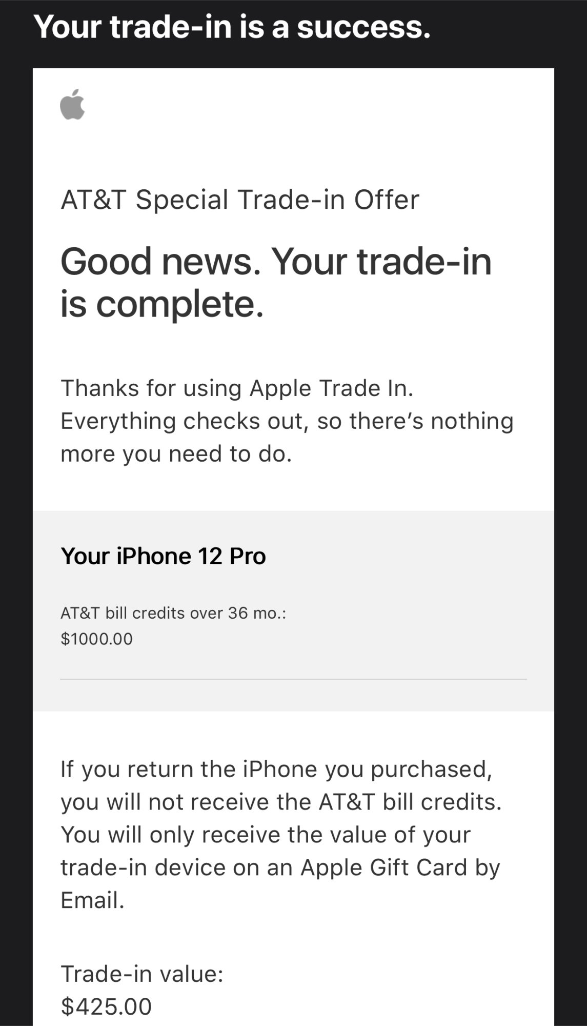 Apple trade in is not the same as ATT, Both my ATT trade ins for $1000 each have been processed.