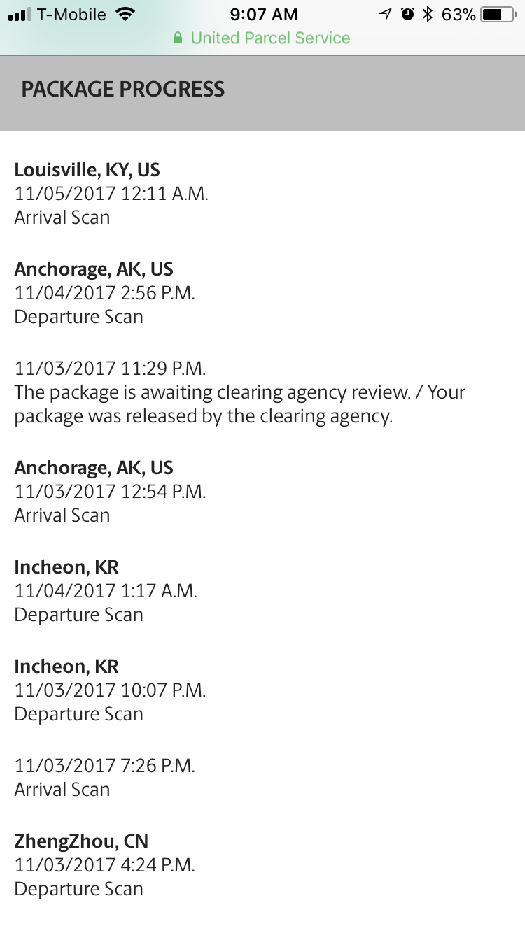 You're welcome. They do have to clear customs but that's no guarantee UPS did a scan for it. The customs check probably involved looking at the plane manifest and giving it an ok.Okay. Thanks. Just thought phones would have to clear customs in Anchorage so there’d at least be a scan for that.