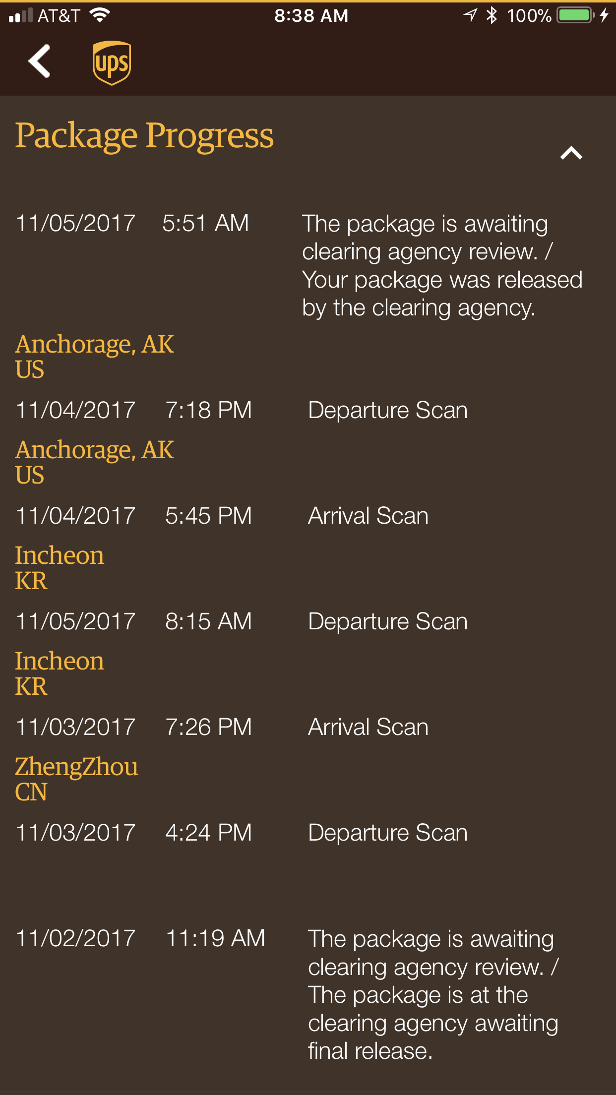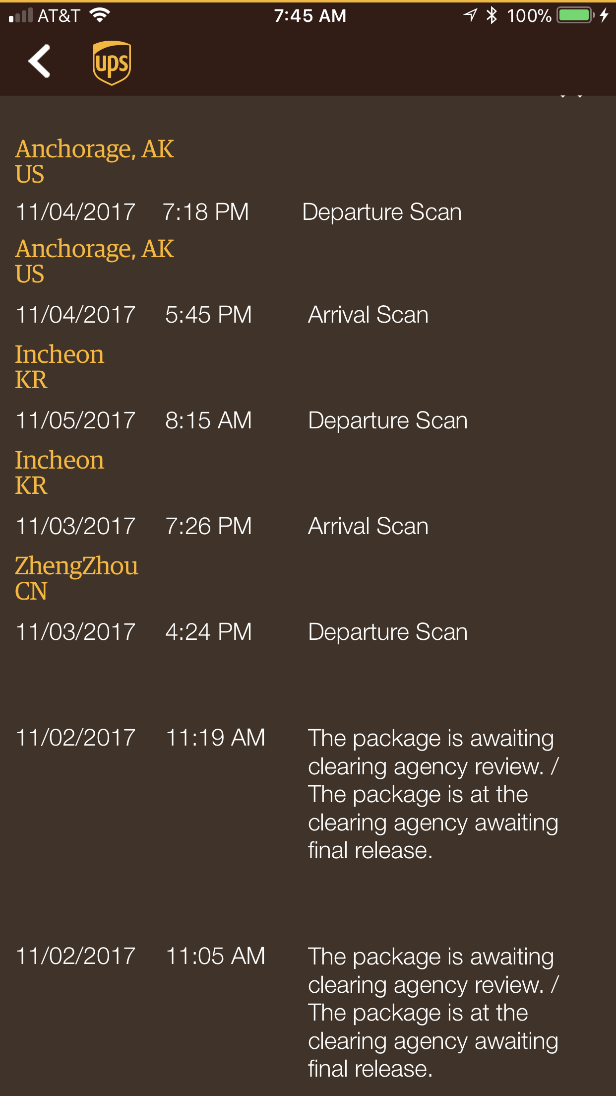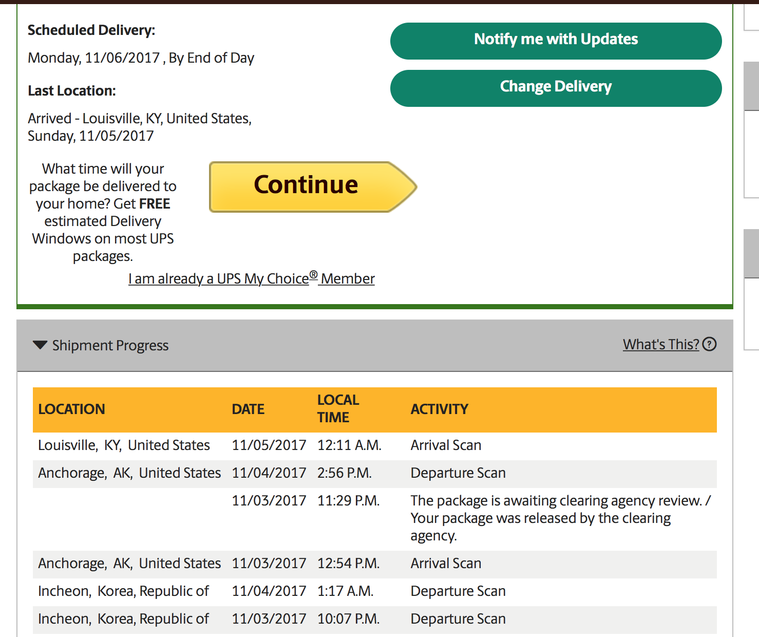 Based on other planes leaving Incheon to Anchorage, I think UPS put our phones on another Korean airline with superjet that actually departed at 8:15, but only had 90 minute flight time. I have arrival-departure scans in Anchorage too. No scan in Louisville, yet vShowed up after the UPS99 arrived in Louisville hour ago. the times do not match the departure of UPS99 from Anchorage even though the departure from Incheon did. Oh well our phones are almost here. UPS texted me and emailed me my phone arrives tomorrow by end of day. So it is near curious if it got ti Louisville earlier or the arrival of the UPS99 plane and general scans triggered the Anchorage arrival and departure info?
