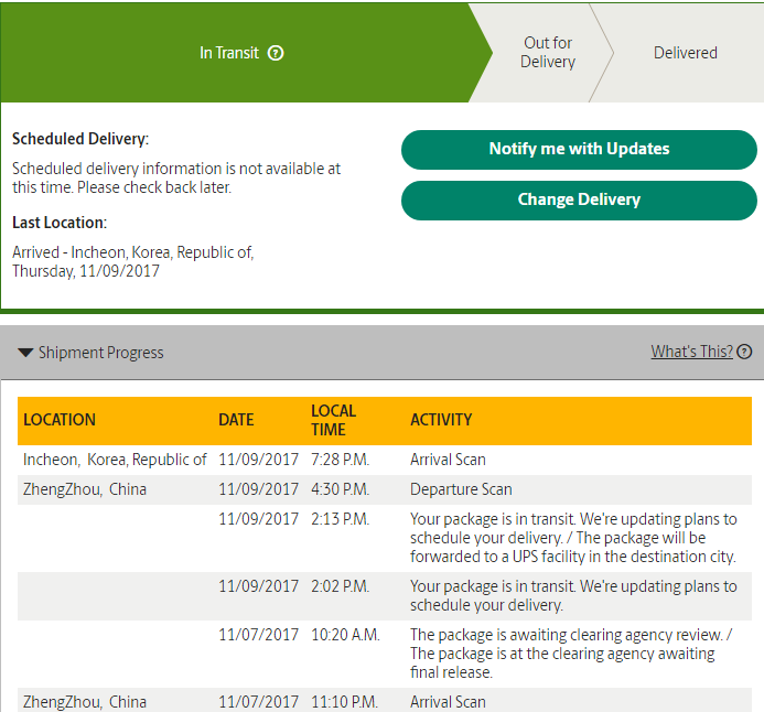 11/08/2017 2:06 P.M. Your package is in transit. We're updating plans to schedule your delivery. / The package will be forwarded to a UPS facility in the destination city.