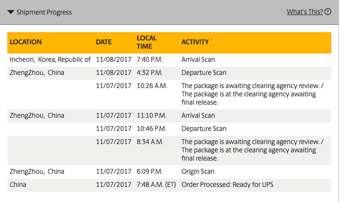 After 2 days, mine is still stuck in China awaiting clearance. I had a Nov 14th delivery date, but now it shows nothing.