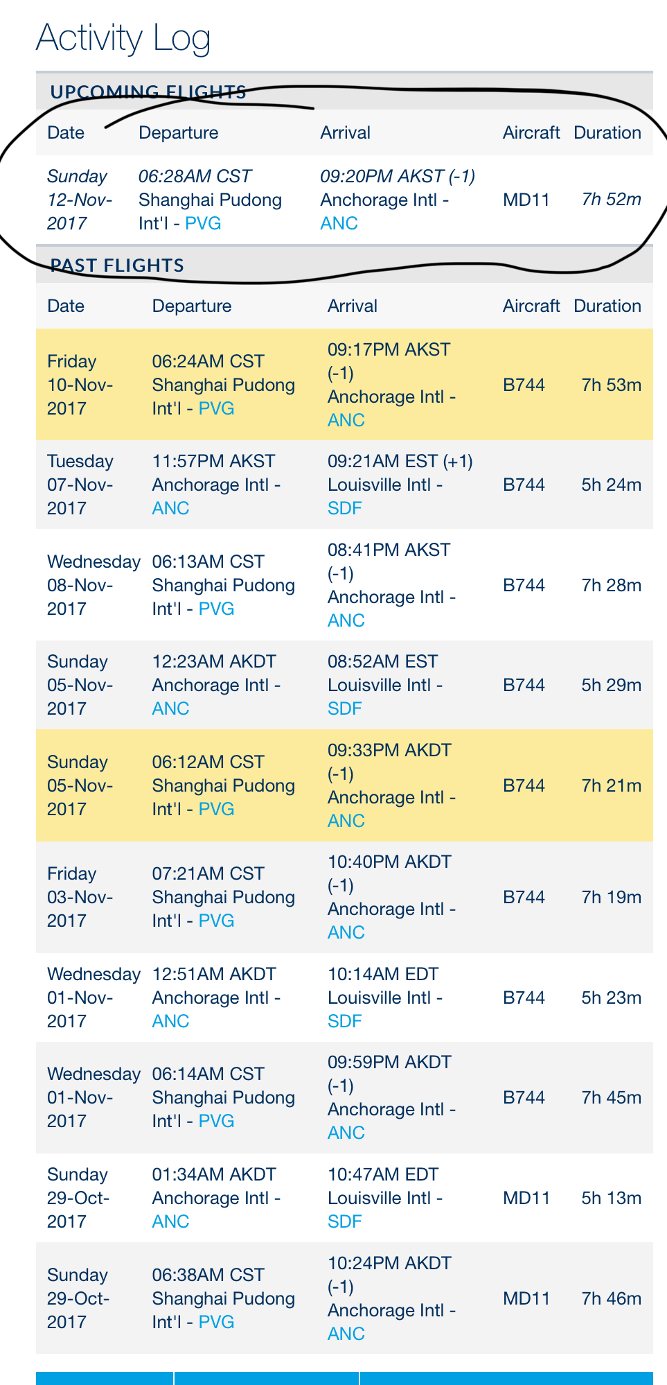 There are two UPS flights from Shanghai to Anchorage, UPS81 and UPS85. Each departs Shanghai about every other day. This show the next one coming up, on Sunday morning.dam it, so it's stuck like that