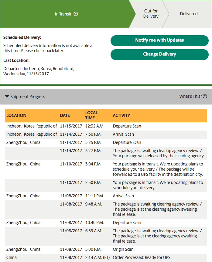 ZhengZhou, China 11/14/2017 9:19 P.M. Your package is in transit. We're updating plans to schedule your delivery. / The package will be forwarded to a UPS facility in the destination city.