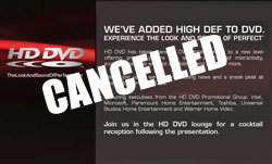 We just got an email which stated that the HD DVD group is canceling its CES press conference; tail severely between legs over today's explosive news that Warner -- the last "undecided" studio -- was going to the other side and doing Blu-ray discs exclusively. We're not sure if that's because the HD DVD group was in 11th hour negotiations with Warner or what, but the mood at that camp has to be beyond somber right now, so it's pretty hard to thump the tub when you've just been dealt a hard losing hand. Notice posted after the break.