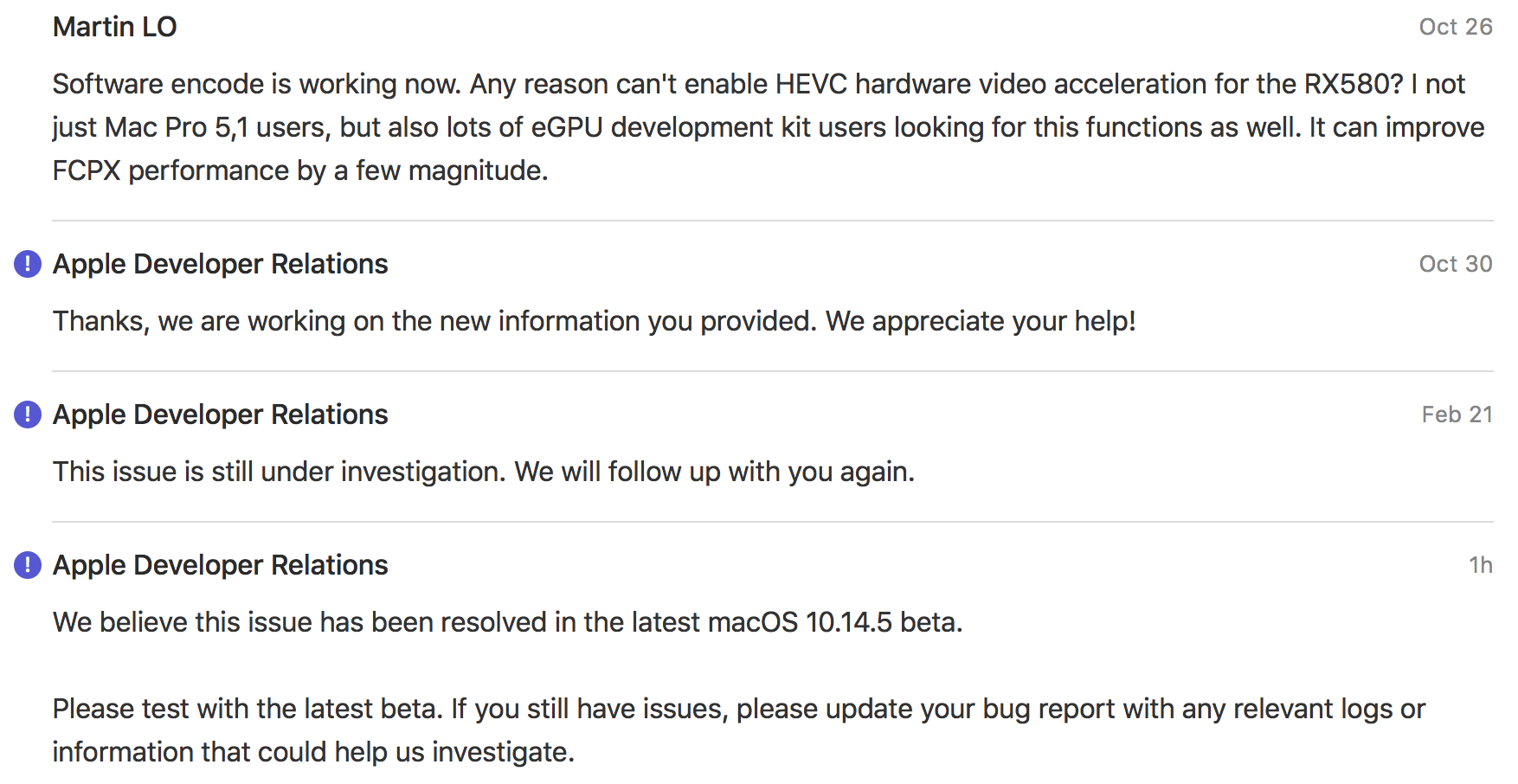 Also, it's confirmed that the RX580 (the same GPU as in the Apple eGPU developer kit) also able to perform HEVC hardware decoding in the current 10.14 beta. I have this GPU in my Mac Pro now. I have done the test by myself (as per the following screenshot). 4K HDR HEVC BT.2020 video can be play back smoothly in QuickTime Player on my Samsung CHG 90 with just the RX580.