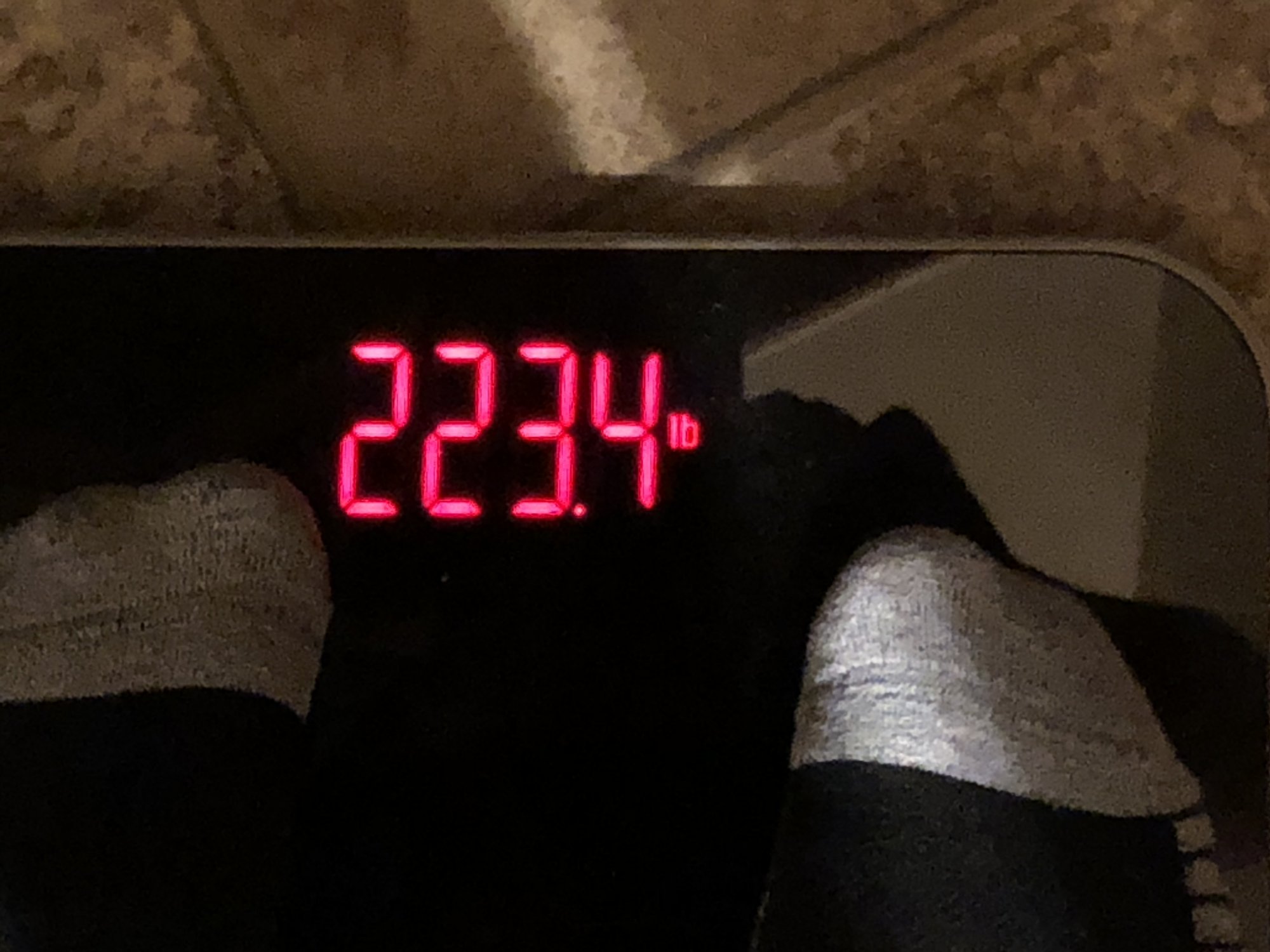 Final Weigh-in. The goal was to ~220, and I now stand ~223. I’ve actually added an additional 10 pounds from where I was for my ‘Part one’ of my bodybuilding back in 2019 (I was ~212 then). So I have more than enough mass to come even bigger and stronger.