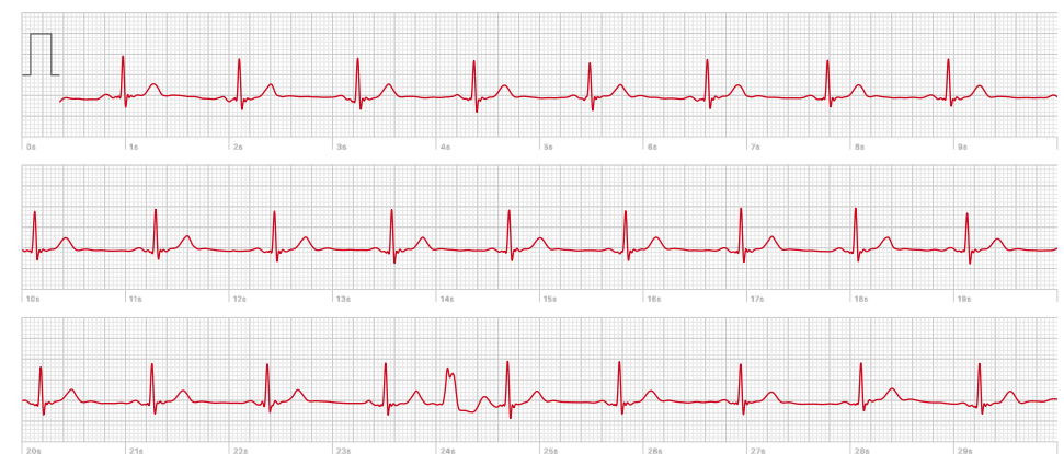I thought I’d share a ECG that caught something that, well, most of us have but most of us don’t notice: premature ventricular contractions (PVC). These are an extra beat but it feels like a missed beat or a heart hiccup. It’s a really weird thing and baring any major risk issue, they’re very much like a hiccup, benign, something that’s not easily fixed and annoying as bleep. They may also be driven by stress and these little bugger feed on themselves because it’s stressful having them.