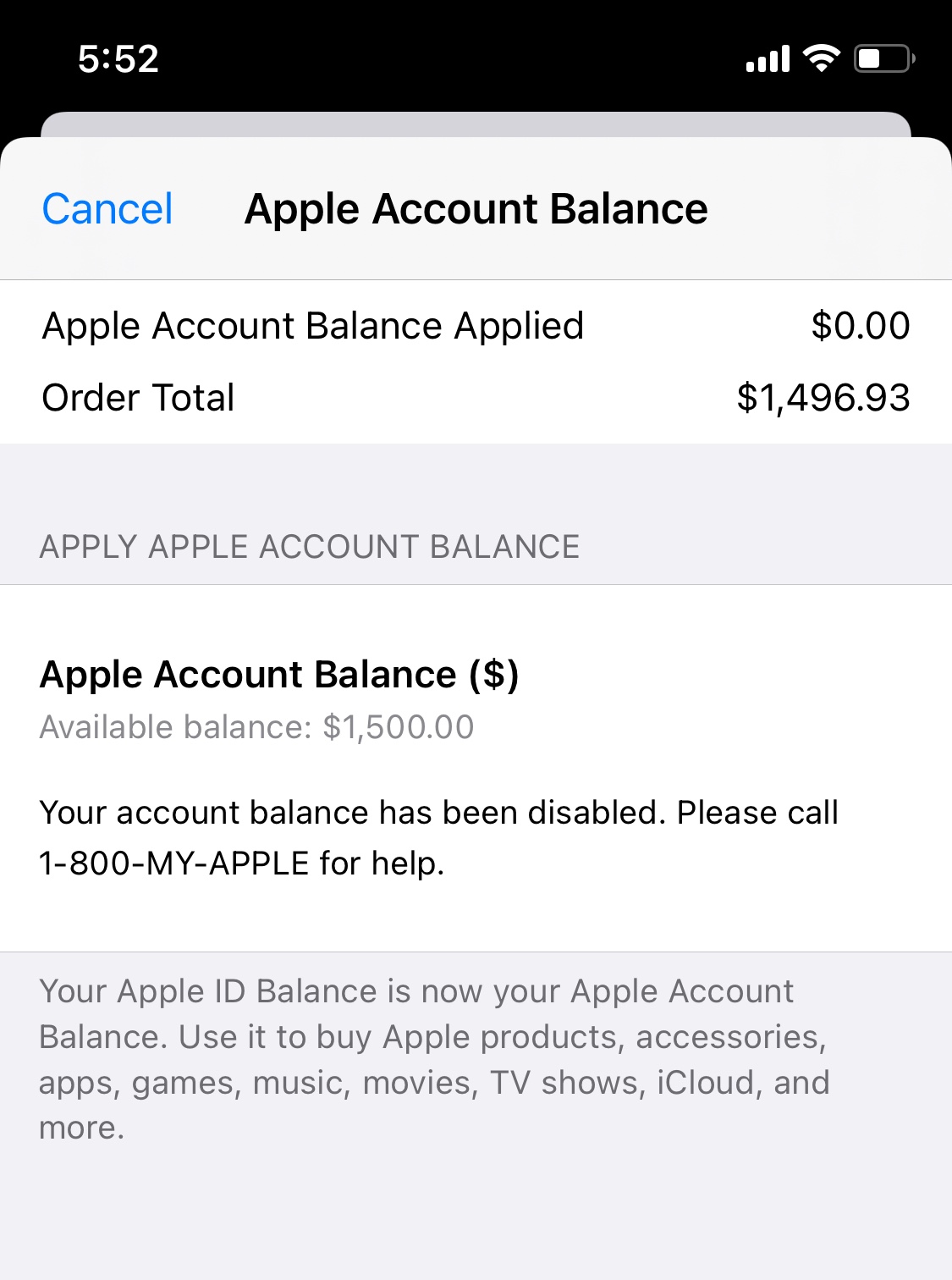 I ordered a $1000 item on the Apple store app then the next day the order was cancelled without a single notice from Apple. An hour ago I received the refund back to my credit store balance but was not able to use it. The message is ''Your account balance has been disabled. Please call 1‑800‑MY‑APPLE for help.''