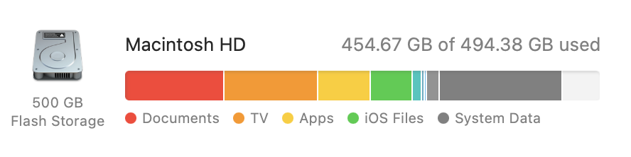 I also noticed that a good amount of your storage is consumed by "iOS files," which are iPhone/iPad backups. If you delete those, then you'll free up a good amount of storage. Also, delete all those downloaded movies and TV shows (TV), and clean out your desktop, documents, and downloads folders (Documents).