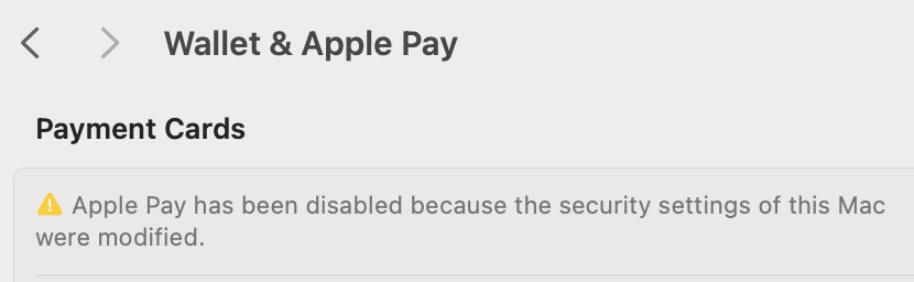 Well, I get the message, when I go to System Settings/Apple Pay, "Apple Pay has been disabled because the security settings of this Mac were modified."