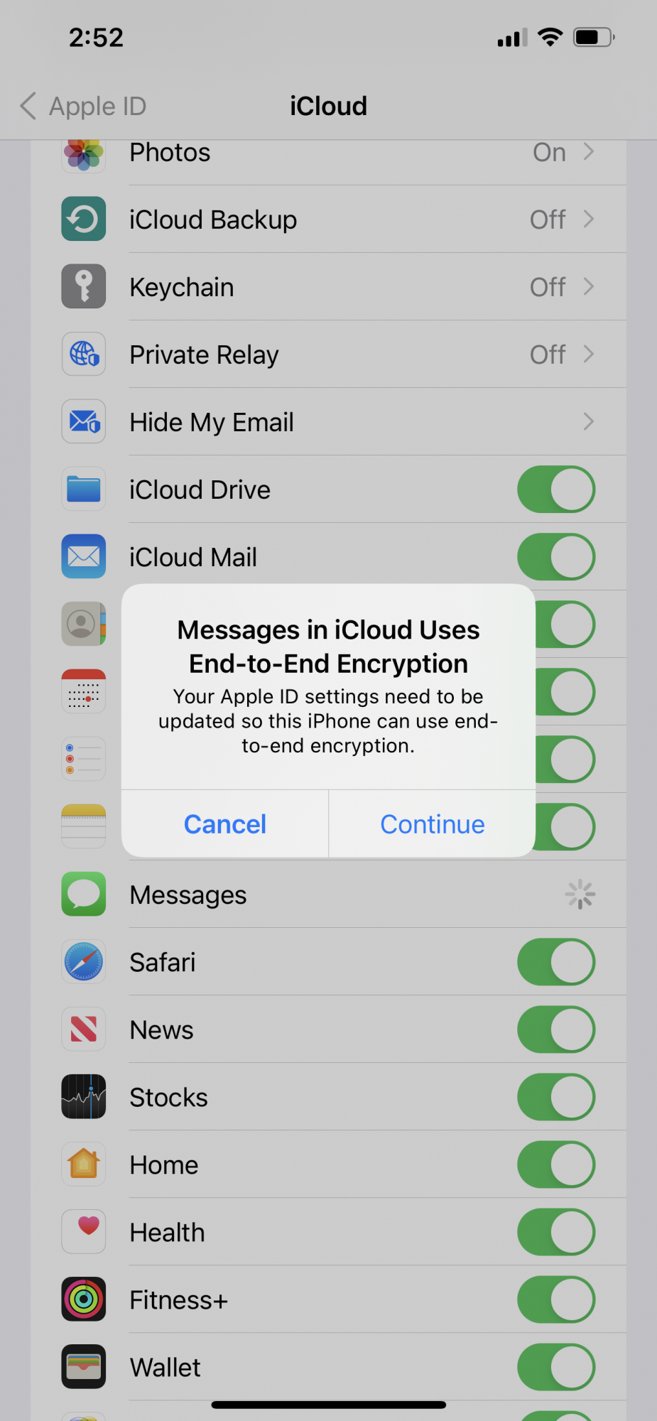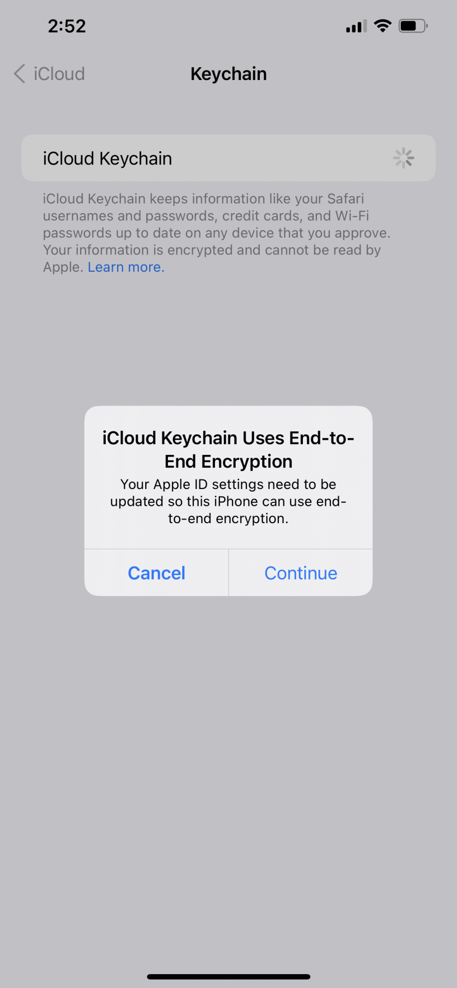 A few days ago I got a message on my MacBook Pro that I needed to 'update my AppleID settings' to gain access to all the services. I entered my Apple ID password but the same message would re-appear. Then I got the same thing on my iPhone. I lost access to all my saved passwords, my iMessages in the cloud, access to my HomeKit etc. Everything that requires end-to-end encryption. I called Apple and spent hours with lower end techs who were basically clueless and finally got through to a senior tech who could not help. He forwarded my case to Apple engineers. They will apparently take 5 days to even look at my case! Anyone out there had a similar issue????